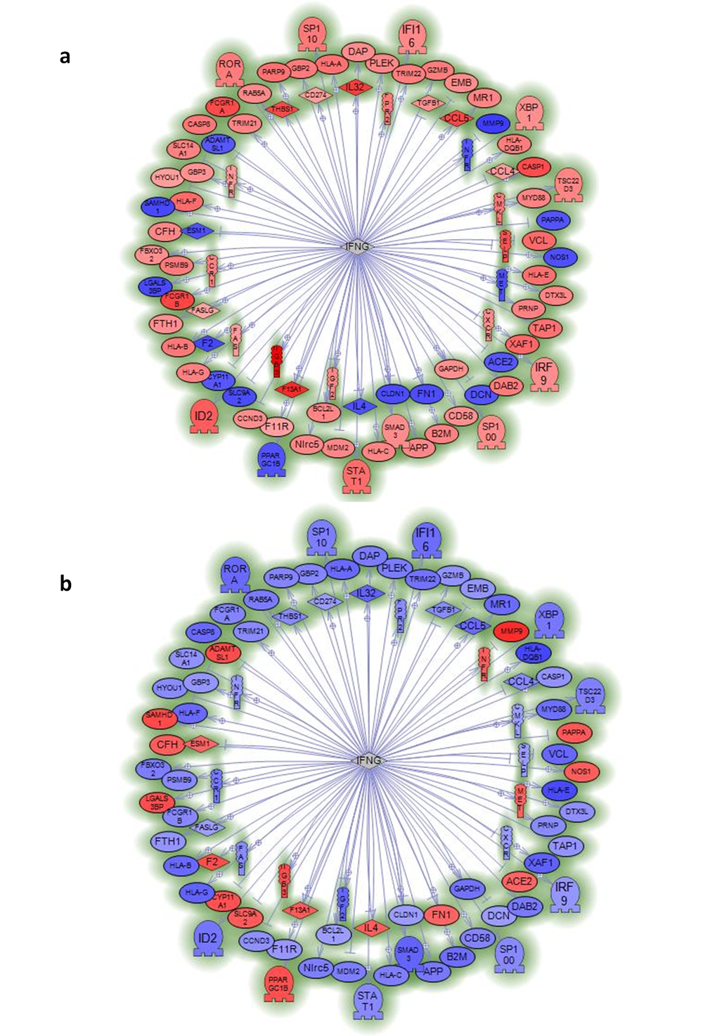 We also employed Ariadne software package (since acquired by Elsevier B.V. and renamed Pathway Studio) to perform a sub-network analysis on these 1721 mRNAs in order to group them. A sub-network is a group of genes structurally or functionally connected to a common gene; a sub-network is identified when there are known relations among genes recorded on the Ariadne database. Our sub-network analysis converged on six genes: interferon (IFN)-γ (IFNG) ; T-cell receptor (TCR); tumor necrosis factor (TNF); SP1 transcription factor (SP1); transforming growth factor (TGF)-β1 (TGFβ1); and a cytokine, namely, IL-32 (Fig.2 and Supplementary Fig. 2-7).When we compared centenarians with young people and septuagenarians with young people, we observed an almost mirror image: genes that were up-regulated in centenarians tended to be down-regulated in septuagenarians thus suggesting that activation of these networks are associated with exceptional aging. We conclude that mRNA expression in human exceptional longevity significantly differs from that of ordinary aging.