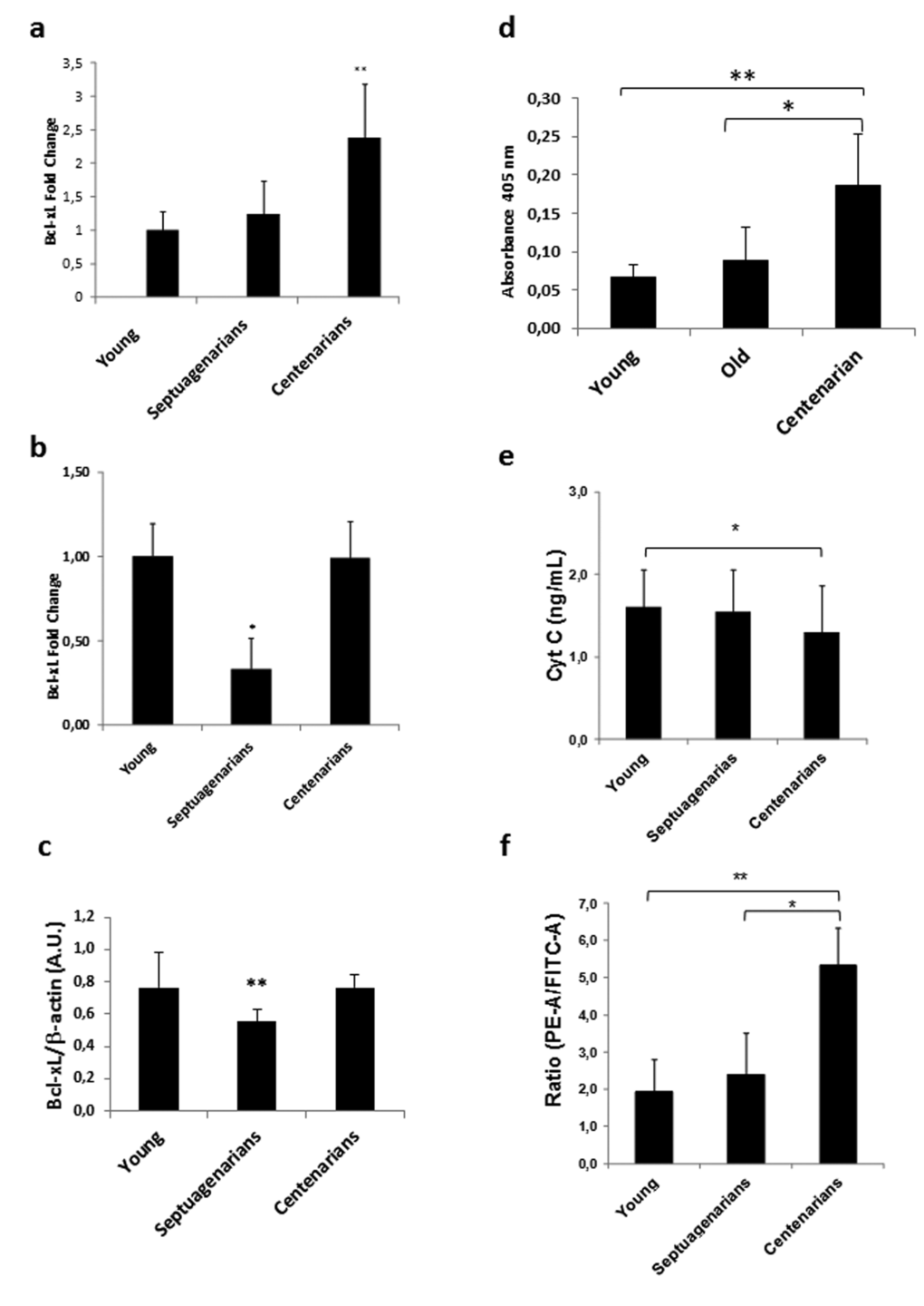 Taken together, our results demonstrate that, similar to what we found in microRNA expression, septuagenarians (normal aging) display a cell health impairment which is not so evident in young people or centenarians (exceptional aging). Moreover, they suggest that Bcl-xL may play a major role in healthy aging.