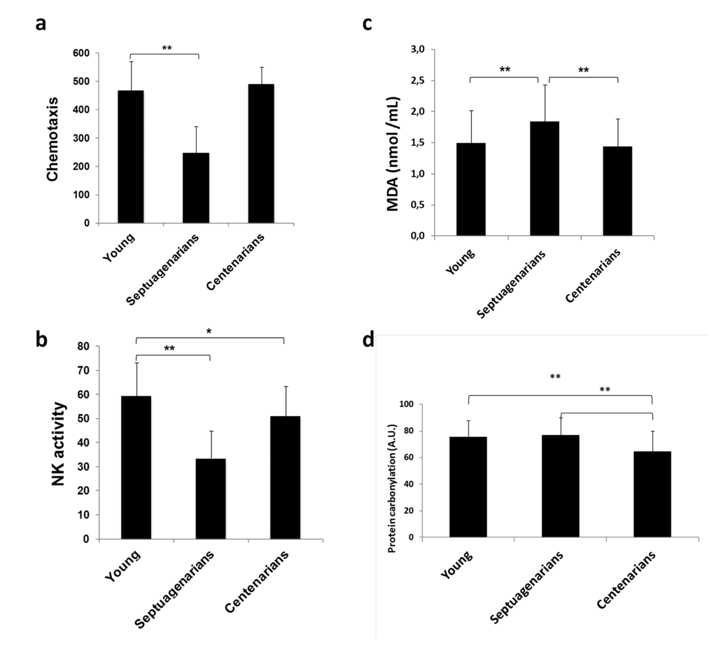 As stated before, BcL- xL is important in the development and maintenance of the immune system [24]. Moreover, immunosenescence (age-related decline of immune function) has been posited responsible at least in part for the well-known increased incidence rates of infections, cancer, and autoimmune diseases that arise in elderly persons who display normal aging [31] [32]. We thus analyzed lymphocyte function in centenarians and showed that leukocyte chemotaxis and NK cell activity were significantly impaired in septuagenarians compared with young people whereas in centenarians these indicators of immunosenescence were similar to the picture noted in young people (Figs. 4a and 4b). Therefore, using centenarian-donated PBMCs, we observed a number of similarities between centenarians and young persons, which were not reflected in cells donated by septuagenarians, in a variety of biological factors suggestive that centenarians may evade the relentless onset of immunosenescence that is seen in normal aging. This is in keeping with the idea of immuneaging first postulated by Franceschi [33].