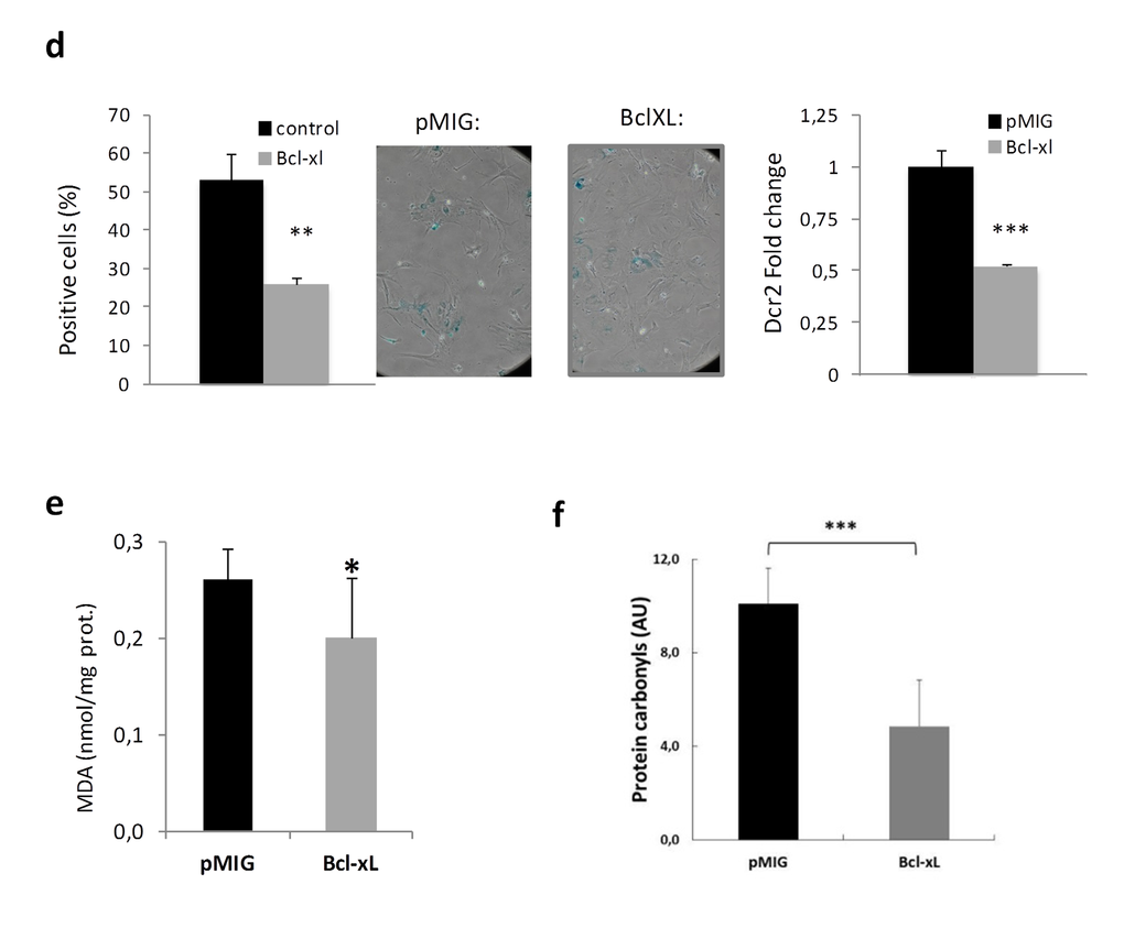 Cells in culture carry out a limited number of divisions before undergoing senescence, a process associated with mammalian aging [36]. In an effort to determine the functional role of BcL-xL on cellular senescence, we retrovirally transduced mouse embryo fibroblasts (MEFs) with a plasmid encoding BcL-xL in parallel with empty controls (pMIG). Interestingly, we did not observe any difference between them at early passage (data not shown), but after four passages in culture, BcL-xL overexpressing cells (Fig. 5a) exhibited lower accumulation of p16Ink4a, p14Arf, and p21Cip, all of them cell cycle inhibitors, see Fig. 5b and increased proliferation (Fig. 5c) compared to control cells. Moreover, ectopic expression of Bcl-xL significantly delayed the accumulation of senescent cells in the culture measured by a decrease in the number of senescence-associated β-galactosidase (SA-β-GAL) positive cells and lower levels of Dcr2 (another marker of senescence, Fig. 4d). Moreover, we observed that Bcl-xL–overexpressing MEFs were protected against oxidative damage as evidenced by low protein carbonylation and lipid peroxidation (measured as MDA), i.e. the same picture as that observed in centenarians (Fig. 5e and 5f). These data suggest that Bcl-xL confers protection against cellular damage accumulation.