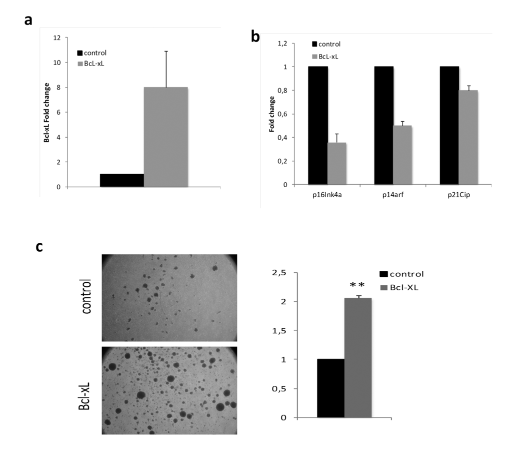 In order to extend this analysis to a more relevant cellular setting, we transduced lymphocytes from septuagenarians with BcL-xL (Fig. 6a). We observed that p16Ink4a, p14Arfand p21Cipcell cycle inhibitors expression was lower in septuagenarian cells overexpressing BcL-xL than in controls (Fig. 6b). This correlates with their increased proliferation capacity stimulated by phytohaemaglutinin (PHA) (Fig. 6c). In these respect, cells from septuagenarians, when they overexpress Bcl-xL, behave like those from centenarians. Together, our data indicate that high levels of BcL-xL exert a beneficial effect in cellular aging and support the notion that BcL-xL could contribute to the exceptional longevity and healthspan of centenarians.