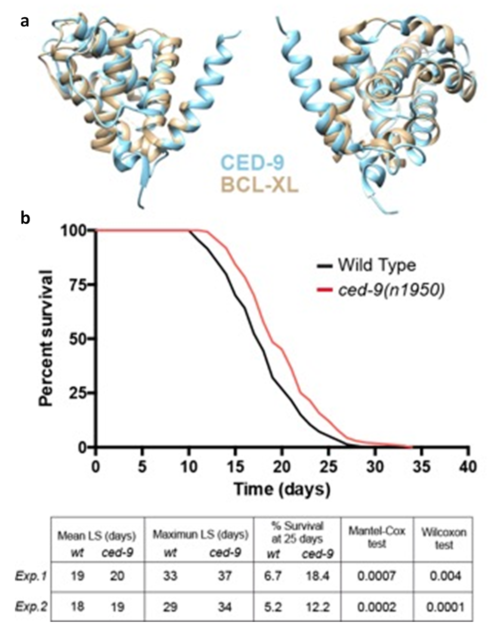 To assess if increased activity of Bcl-xL promotes longevity in vivo we turned to the simple model organism C. elegans. This nematode has several advantages for aging studies: it has a short life span of around twenty days, it shares the main hallmarks of human aging and around 70% of the human genome has a C. elegans ortholog, including the apoptotic pathway that was originally described in this organism [37,38]). ced-9 is the only C. elegans member of the Bcl2 anti-apoptotic family and thus the ortholog of human Bcl-xL, showing 44% homology and the same protein domains (Fig. 7a). However, it is important to state that there are differences between CED-9 and mammalian anti-apoptotic Bcl-2 homologs in terms of the dynamic behavior of BH3-binding hydrophobic cleft and the region that participates in the CED-4 binding activity. This should be taken into account in drug screening studies in which model organisms such as C. elegans are used [39].