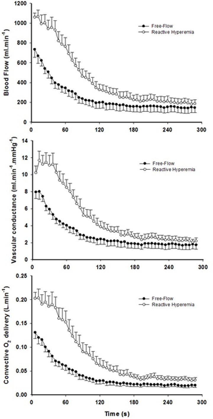 The brief period of ischemia during exercise and the subsequent superimposing of the RH on the typically mono-exponential decay of blood flow post-exercise (FF) enhanced convective O2 delivery by 111% (Figures 1 and 3). Likewise, both limb blood flow and leg vascular conductance AUC were substantially augmented (+111% and +77%, respectively, Figure 1). As a result of these changes in bulk limb blood flow, capillary blood flow was significantly enhanced (+45%, Figure 2) as was microvascular re-oxygenation AUC (Figure 2), implying an improvement in local O2 availability.