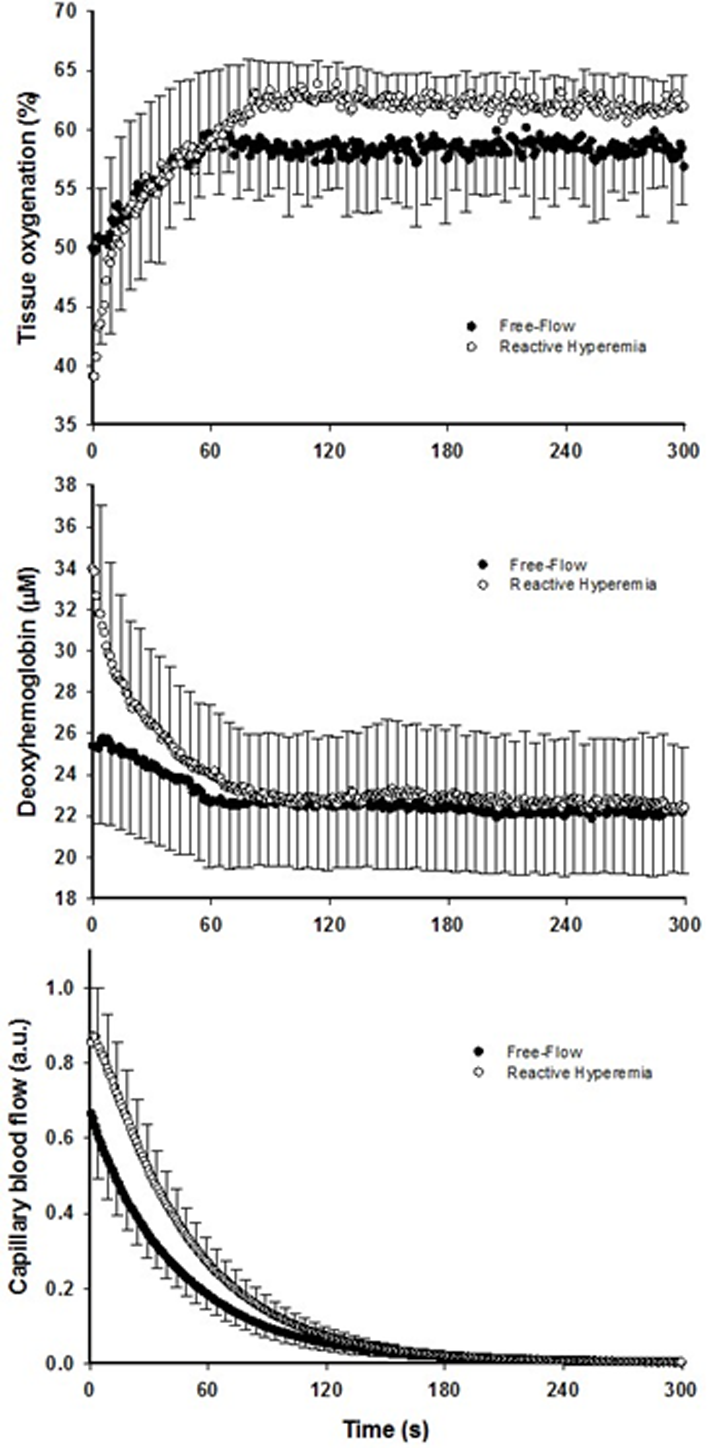 Table 2. Phosphocreatine and tissue oxygenation dynamics during the recovery from plantar flexion exercise in free flow and reactive hyperemia conditions.