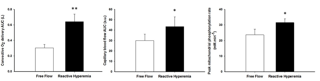 In summary, using an integrative approach, this study has revealed a hemodynamic reserve in the contracting calf muscle accessible under conditions of superimposed reactive hyperemia, which appears, to some extent, to be blunted in the microcirculation with advancing age. In addition, this study provides the first direct evidence of an excess capacity of mitochondrial respiration relative to peripheral O2 transport capacity in the calf muscle of untrained elderly
