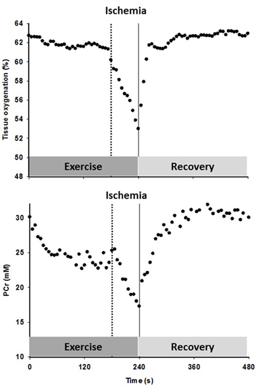 The acute manipulation of O2 availability combined with the in vivo measurement of peak mitochondrial ATP synthesis rate by 31P-MRS offers an opportunity to assess the matching of O2 supply and demand. Using this approach, it has recently been documented that enhanced O2 availability to the muscle, induced by higher fractions of inspired O2 (FiO2 = 1.0), resulted in unaltered mitochondrial function in the calf muscle of elderly individuals [11]. Somewhat in contrast to this finding, Wray et al. [12] reported that enhanced tissue perfusion induced by acute antioxidant administration in elderly subjects improved mitochondrial function, both assessed by MR imaging and spectroscopy techniques, suggesting that a relative hypoperfusion potentially restrains metabolic capacity under normal conditions of oxidative stress. While antioxidant administration in this population likely induced an increase in muscle blood flow by enhanced scavenging of free radicals and a subsequent increase in nitric oxide (NO) bioavailability [13], it may have also directly improved mitochondrial function [14], thus complicating the interpretation of the findings. Given these apparent conflicting results regarding O2 supply and demand in the elderly, circulatory occlusion and the subsequent reactive hyperemia (RH) upon cuff release at the offset of exercise appears to be an interesting alternative experimental model that can, rather simplistically and substantially, locally increase O2 supply [15]. Lacking of the limitations of the previous studies, the application of this approach in the elderly would thus allow the assessment of the putative mismatch between peripheral O2 supply capacity and intrinsic mitochondrial capacity for ATP synthesis with advancing age.