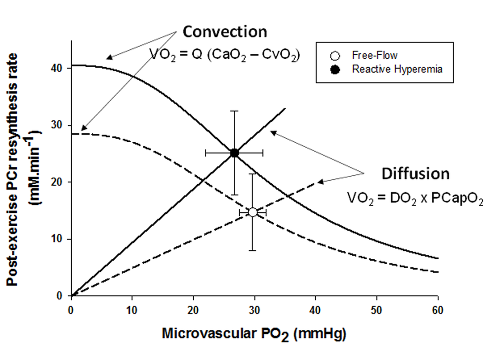 From a theoretical standpoint, the findings from the present study challenge the classic concept of symmorphosis, which postulates that each component of the O2 transport system (heart, blood, capillaries and mitochondria) is matched to demand such that the functional capacity of each step does not limit the maximal overall capacity of the system [56]. Indeed, according to this theory, the peak rate of mitochondrial phosphorylation measured by 31P-MRS should not be sensitive to an acute increase in capillary blood flow and O2 availability within the skeletal muscle. In addition, despite the well-established impairments in the convective component of O2 transport to skeletal muscle with age [1,2], this does not appear to have resulted in a proportional decrease in mitochondrial function in the elderly, as demonstrated in the present study.