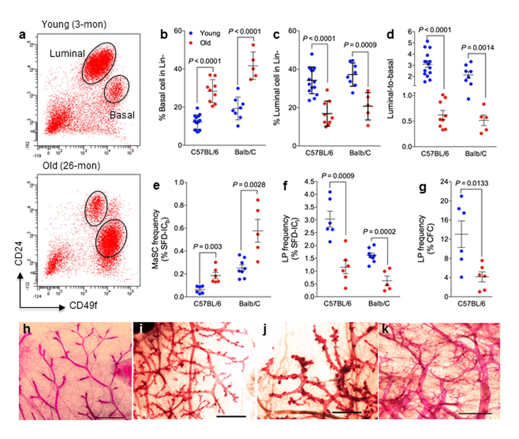 Aging was associated with an altered luminal-to-basal cell ratio, an increase in MaSC frequency and a decrease in LP frequency