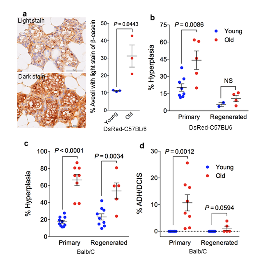 To investigate the role of MaSCs in mammary tumorigenesis, we performed histological examination for the presence of intraductal dysplastic lesions including atypical ductal hyperplasia (ADH) and ductal carcinoma in situ (DCIS) as shown in Supplemental Fig. S3b, which are precursors of carcinoma in rodents and humans, and can develop into palpable tumors when transplanted into hosts that have intact ovaries [23]. In this DsRed C57BL/6 cohort, we observed a higher frequency of hyperplastic lesions in the primary mammary glands from old mice (44 ± 8%, n = 5) than that from young mice (20 ± 3%, n = 8) (Fig. 2b). We also observed a similar trend of increasing hyperplastic lesions in old MaSC-regenerated glands in comparison with their young counterparts, but this was not statistically significant and likely due, in part, to the limited number of outgrowths obtained from young MaSCs in virgin recipients (Fig. 2b). The use of young recipients in the transplant assay may also help alleviate the severity of hyperplastic lesions in the regenerated glands. However, when we evaluated the same endpoint in the BALB/c cohort, we observed a significant increase in hyperplastic lesions in primary and regenerated glands from old MaSCs when compared with theiryoung counterparts (Fig. 2c). We also observed higher frequency of ADH/DCIS in old primary glands than young primary glands in BALB/c mice, but this difference was diminished in the regenerated glands from young and old MaSCs (Fig. 2d). Since most mammospheres are formed by s single MaSC according to our earlier studies [20], these findings indicate that mammary neoplasia can originate from MaSCs and aging can increase the transformation potential of MaSCs.