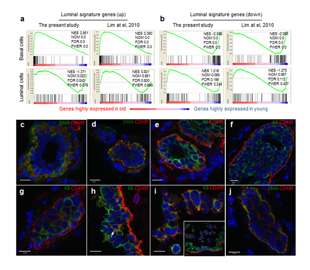 The enrichment of luminal gene signature in old basal cells could be due to either the old basal cells expressing luminal markers or old luminal cells expressing high CD49f and thus being sorted into the basal cell fraction. To explore these possibilities, we co-stained basal and luminal lineage markers, smooth muscle actin (SMA) and cytokeratin 8 (K8) with CD49f. We did not observe any basal cell expressing the typical luminal marker K8, or any luminal cell expressing typical basal marker SMA either in normal or hyperplastic ducts, and CD49fhi cells were mainly confined to the basal layer (Fig. 3c-f). Similar findings were obtained with another typical basal marker K5 (Supplemental Fig. S6). Further query with our RNAseq data showed that basal and luminal cells in aged glands retain typical basal (K5/K14/p63/ID4) and luminal (K8/Gata3/Elf5/Muc1) markers, respectively (data not shown). However, in some hyperplastic lesions, we observed high CD49f expression in luminal cells (Fig. 3g-i), and especially those luminal cells that form alveolar hyperplasia (Fig. 3g) or those dislodged from the ductal wall (Fig. 3i). None of these CD49fhi luminal cells express the basal marker SMA (Fig. 3j), indicating that the luminal signature in old basal cells originated from luminal cells expressing high CD49f.