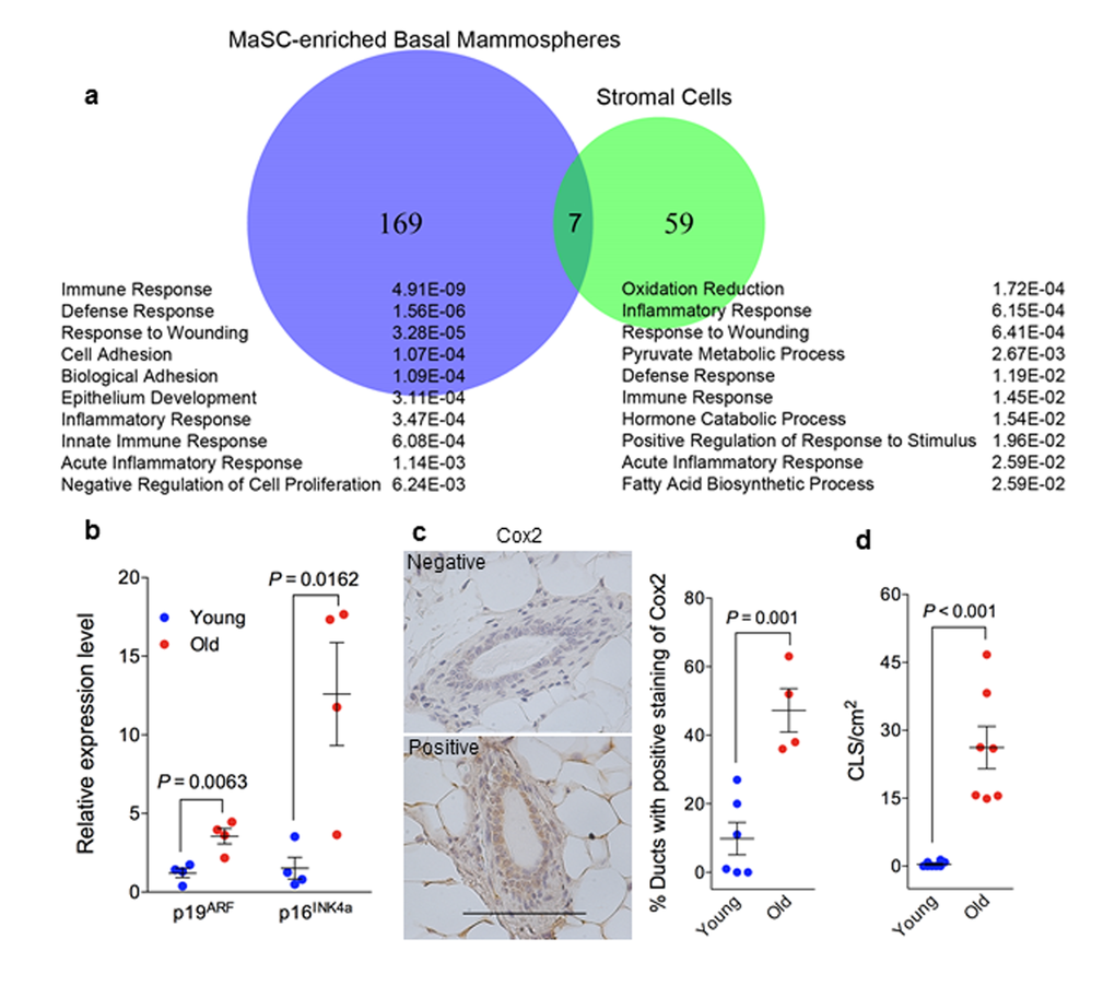 Whole transcriptome sequencing was performed with RNA samples from basal cell derived spheres (highly enriched in MaSCs) and stromal cells (MaSC niche), from young and old mice, to gain insights into the observed differences described above between young and old MaSCs. We identified 176 differentially expressed genes between young and old basal cell derived spheres and 66 differentially expressed genes between young and old stromal cells (Fig. 4a). Functional annotation of these differentially expressed genes with Database for Annotation, Visualization and Integrated Discovery (DAVID) [24,25] platform showed that the primary biological processes in MaSC-enriched spheres were associated with immune, defense, and wound responses, and those in stromal cells were associated with oxidation-reduction, inflammation, and wound responses (Fig. 4a). With respect to the individual genes that are differentially expressed between young and old cells, the Cdkn2a locus, containing p19ARF and p16INK4a, was most highly upregulated (20-fold) in the old stromal cells (adjusted P ≤ .05), which was confirmed with real time RT-PCR assays (Fig. 4b). Cyclooxygenase 2 (Cox 2), which is not expressed under normal conditions in most cells but is elevated during inflammation, was detected at higher frequency in mammary ducts from old mice (48%) than young mice (10%) (Fig. 4c). Macrophage crown-like structures (CLS) as a hallmark of chronic inflammation was elevated in old mammary stromal (26 ± 5 CLS/cm2, n = 7) when compared with their young counterparts where most animals (5 out of 8) had zero incidence of CLS (Fig. 4d). Together, all these findings revealed an elevated inflammatory environment associated with old mammary glands.