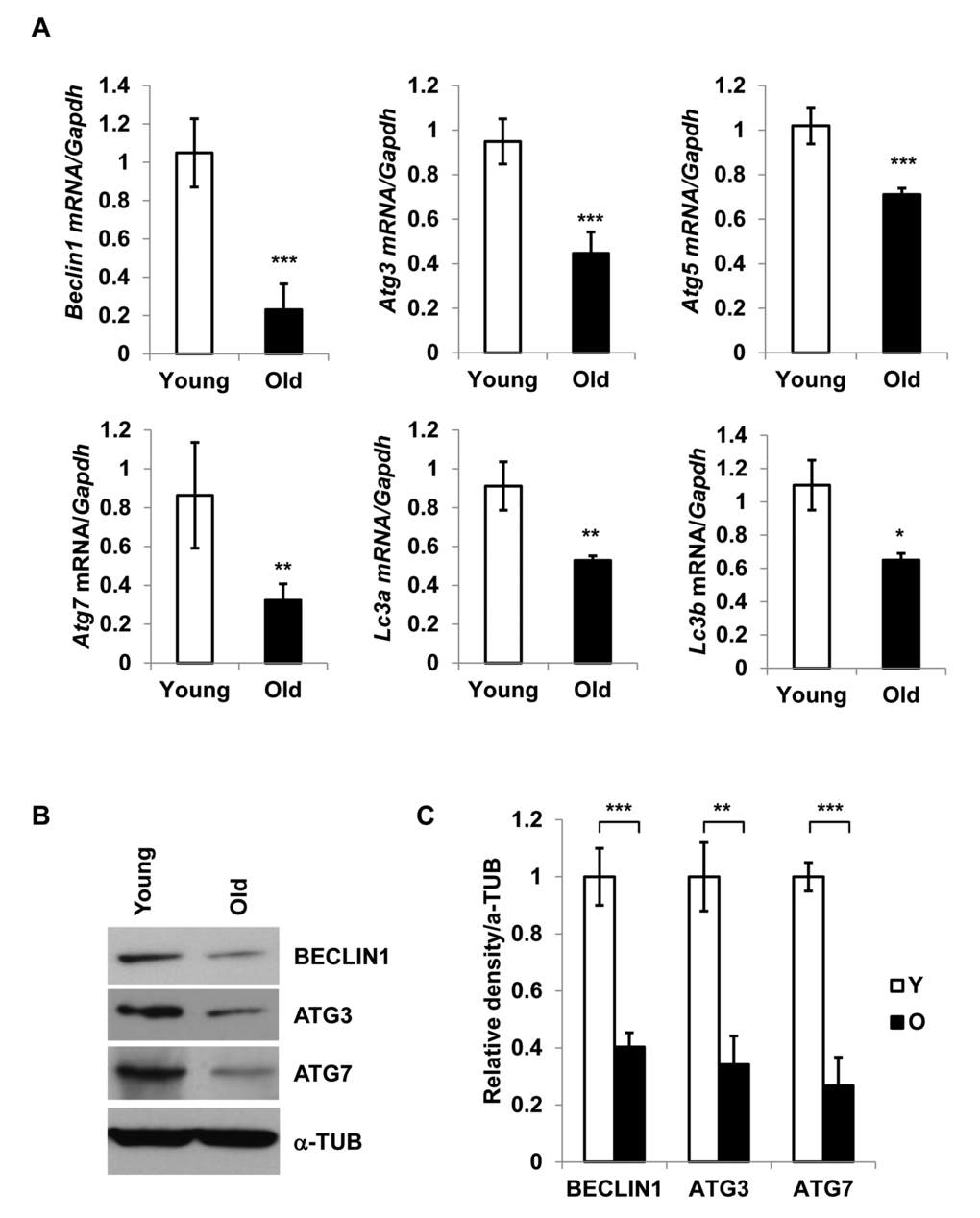 To validate the RT-PCR results, we performed Western blot analysis of Beclin1, Atg3, and Atg7 on SVFs derived from young and old mice (Fig. 1B). The results confirmed diminished protein expression of autophagy-associated proteins in old SVFs (Fig. 1B and1C). These data suggested that age-associated reduction of autophagy components may compromise the autophagy process, which may in turn result in increased ER stress and elevated pro-inflammatory cytokine production in old adipose tissue.