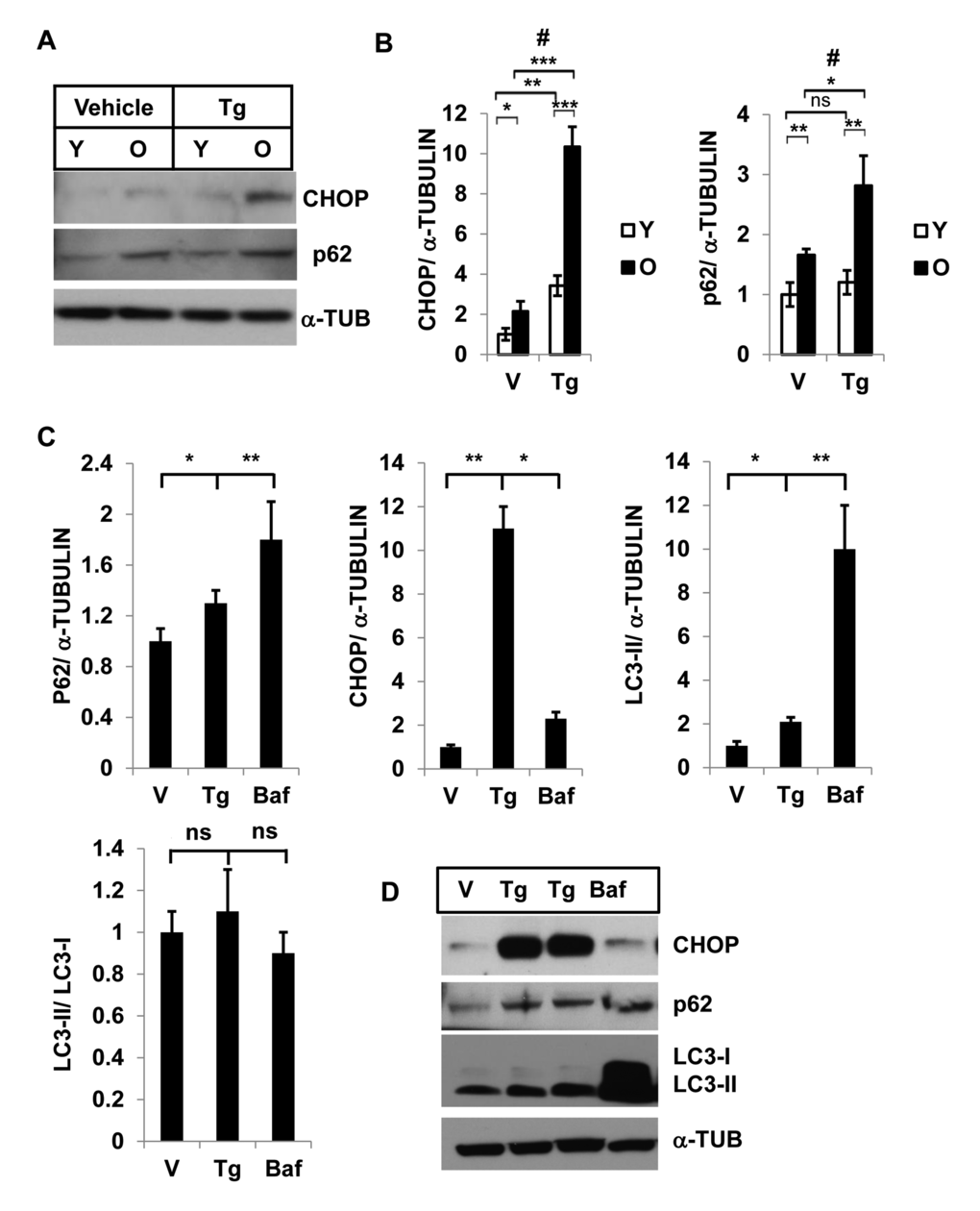 To determine ER-stress and autophagy activity, we treated SVFs from young and old mice with either vehicle or the ER stress inducer Tg, and evaluated the expression levels of p62 and CHOP by Western blotting (Fig. 2A). We found significantly higher levels of both p62 and CHOP in old, compared to young, SVFs treated with either vehicle or Tg. (Fig. 2A, 2B). The accumulation of p62 also paralleled the CHOP expression in old SVFs, suggesting that compromised autophagy correlates with elevated ER stress response in old SVFs.