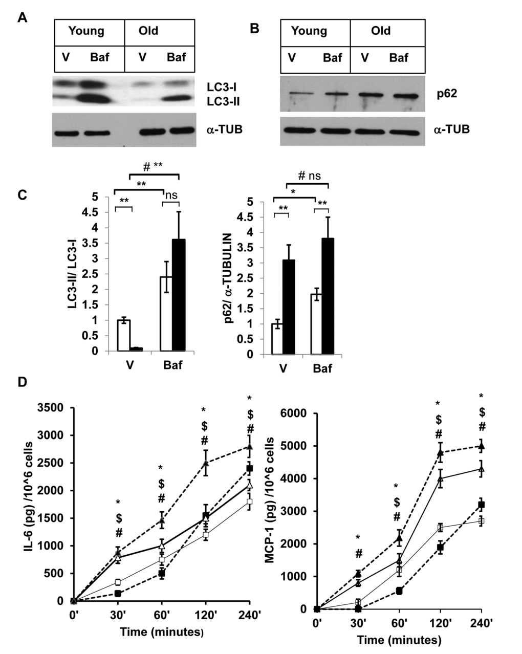 To corroborate the association between autophagy activities in the SVFs and inflammation, we performed autophagy blocking experiments using SVFs from young and old mice with Baf. We then measured the two major pro-inflammatory cytokines (IL-6 and MCP-1) in the cultured supernatants at different time points after the treatments. We observed significantly higher levels of IL-6 and MCP-1 release by old, compared to young SVFs that are treated with either vehicle or Baf at 30 min, 1h, 2h and 4h (Fig. 3D). Treatment of Baf induced increased cytokine release by old SVFs at all the time points examined. We also noticed an initial decrease in the levels of both IL-6 and MCP-1 from young SVFs upon Baf treatment. However, at 4h, the levels of both cytokines were higher in the Baf-treated young SVFs.
