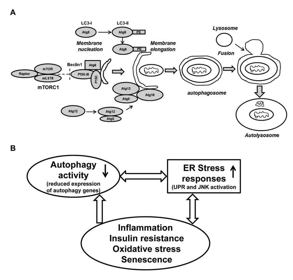 We speculated that elevated ER stress in aging adipose tissue may be due to defective protein turnover by proteasomes and/or lysosomes. Recent reports suggested that the macro-autophagy (hereafter autophagy) pathway, an evolutionarily conserved cellular protein degradation mechanism, contributes to ER stress [12,13]. Autophagy is a catabolic process for autophagosome-lysosomal degradation of bulk cytoplasmic content of proteins. There are three major steps that regulate autophagy [14] a) induction: in response to ‘nutrient deprivation’, phosphatidylinositol 3-kinase (PI3K) activates the mammalian target of rapamycin (mTOR), which in turn, blocks autophagy through inhibition of AuTophaGy related (Atg) 1 from recruiting its partners Atg13 and Atg17, b) Vesicle nucleation: is mediated by Atg6/Beclin-1, which forms a complex with Vps34, the class III PI3K. Beclin-1 is an important interface between autophagy and cell death pathways, by virtue of its binding capacity with anti-apoptotic proteins Bcl2 and Bcl-xL, c) Vesicle elongation: this process involves Atg3-and Atg7-mediated conjugation of microtubule-associated protein1 light chain 3 (MAP LC3-I) to the membrane lipid phosphatidylethanolamine to form LC3-II. This serves as a recognition site for LC3-binding chaperones such as SQSTM1/p62 that deliver their cargo to autophagosomes. Once formed, autophagosomes traffic along microtubules to reach lysosomes where they fuse to form autophagolysosomes, allowing the degradation of their contents by lysosomal acid hydrolases. The implication of autophagy has been demonstrated in many inflammatory diseases that involve ER-stress response, including obesity [15-17], non-alcoholic fatty liver diseases (NAFLD) [18], myopathies [19], and neurodegeneration [20]. The nutrient sensing TOR pathway is well known to affect several crucial cellular functions including protein synthesis and autophagy that modulate aging processes [21]. More importantly, pharmacological agents that inhibit mTOR, and thereby promote autophagy has also been demonstrated to extend health span and lifespan of the organisms. For example, spermidine and resveratrol promote autophagy [22], rapamycin reprogram energy metabolism in old hearts by transiently mitochondrial remodeling in mice [23].