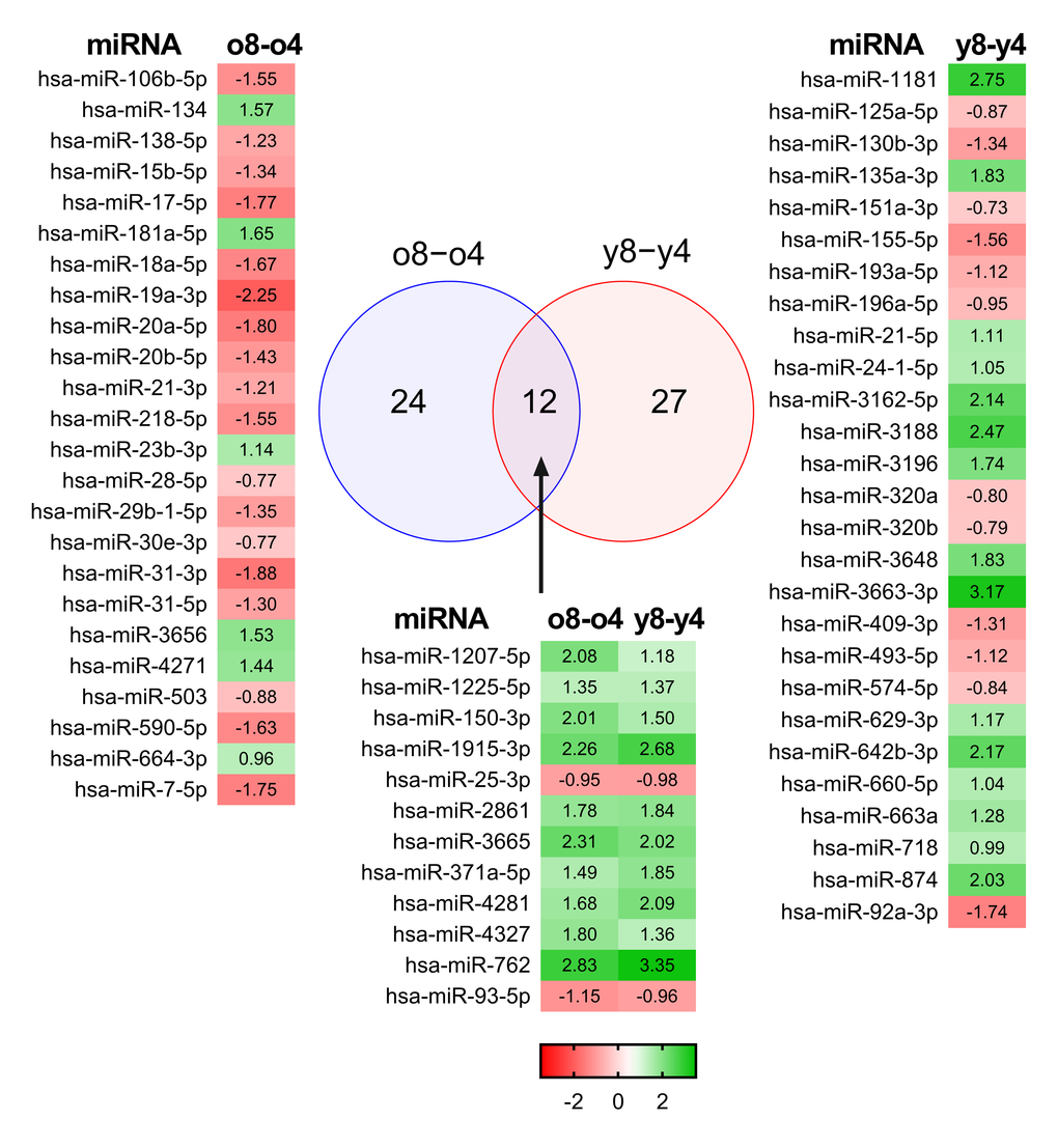 From among the 308 miRNAs, we were able to identify 63 differentially expressed miRNAs (Fig. 1). Interestingly, the miRNA profiles of the young and elderly donors were relatively similar in the early passages. The most prominent changes in miRNA expression were seen towards the late passages. During the expansion of BM-MSCs derived from young donors, the expression of 39 miRNAs was changed, whereas 36 miRNAs were differently expressed in old donors. BM-MSCs from young donors behaved differently during passaging compared to BM-MSCs from the old donors, as both groups shared only 12 differentially regulated miRNAs (Fig. 1). The direction of expression change was also opposite. Our results demonstrate predominant down-regulation of miRNA expression in the old donors’ samples and up-regulation in samples from young donors. Of the twelve miRNAs that underwent changes in their expression during expansion in both donor groups, ten were up-regulated and two were down-regulated in both young and old donors.