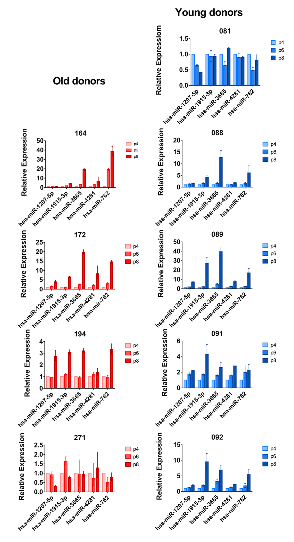 In order to validate the microarray results, we performed quantitative PCR for a selected set of differently expressed miRNAs in both young and old donor BM-MSCs (miR-1207, miR-1915-3p, miR-3665, miR4281, and miR-762). Our qPCR results confirmed our microarray results. When individual donors were analyzed separately, we noticed that BM-MSCs from donors 081 (young) and 271 (old) showed no considerable changes during passaging (Fig. 2). These two donors were excluded from further pairwise analyses (Table 1).