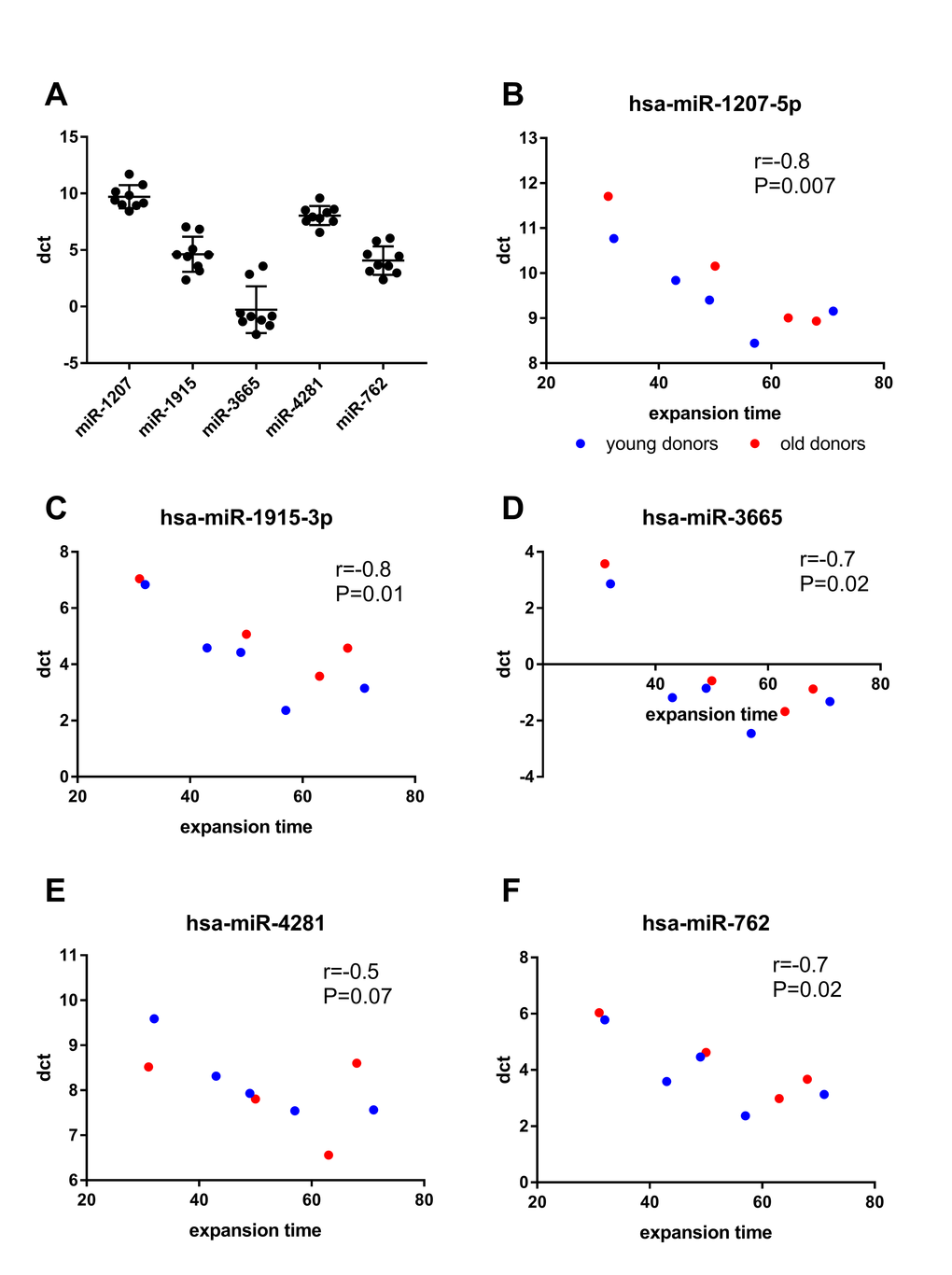 In our previous work, we have shown that the proliferation capacity and the actual time until passage 8 is reached vary greatly between individual BM-MSC donors [13]. Similar variation was seen in qPCR with delta Ct values between donors at passage 8 (Fig. 3A). To investigate whether the variation in miRNA expression could be explained by expansion time, we performed a correlation analysis. When both young and old donor BM-MSCs were included in the analysis, the dct values of miR-762, miR-1207, miR-1915 and miR-3665 at passage 8 inversely correlated (P<0.05) with the expansion time, whereas for miR-4281, such correlation was only seen in the young donors. (Fig. 3B-F).