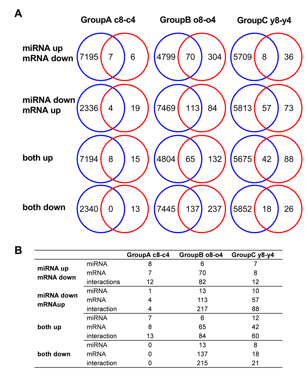 To narrow down the list of potential targets, we compared the predicted targets of all up-regulated or all down-regulated miRNAs (Fig. 4A blue circles) with the mRNA expression data derived from the same cells (Fig. 4A red circles). The overlap between these two groups was then investigated in each group (A-C). In group A (c8-c4), the number of down-regulated mRNAs was 13, 7 of which, were predicted to be potential targets of up-regulated miRNAs in the same group. On the other hand, 23 mRNAs were up-regulated, and, we demonstrate in more detail the number of predicted interactions and the number of miRNA and mRNA molecules participating in these interactions in Figure 4B.