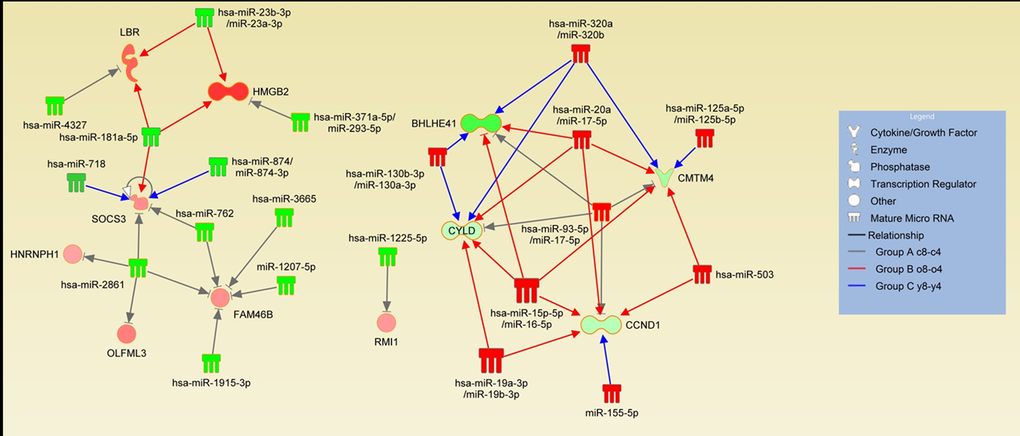Based on the known functions of miRNAs, we focused on the mRNAs that were down-regulated and corresponding miRNAs that were up-regulated and the mRNAs that were up-regulated and corresponding miRNAs that were down-regulated in group A. Seven potential genes were down-regulated (FAM46B, HMGB2, HNRNPH1, 4 of them were predicted to be potential targets of down-regulated miRNAs, while 8 were potential targets of up-regulated miRNAs (Fig. 4A). In group B (o8-o4), 374 mRNAs were down-regulated. Of these, 70 were predicted to be potential targets of up-regulated miRNAs, while 137 were potential targets of down-regulated miRNAs in the same group. On the other hand, 197 mRNAs were up-regulated, with 113 predicted to be potential targets of down-regulated miRNAs while 65 were potential targets of down-regulated miRNAs. Lastly, in group C, down-regulation was only seen in 44 mRNAs, 8 of which were predicted as potential targets of up-regulated miRNAs and 18 were predicted targets of down-regulated miRNAs. In contrast, 130 mRNAs were up-regulated. Of these, 57 were predicted to be potential targets of down-regulated miRNAs, while 42 were potential targets of up-regulated miRNAs. Since a single miRNA may target several mRNA molecules and an individual mRNA molecule may be regulated by several different miRNA molecules LBR, OLFML3, RMI1, SOCS3) and four potential genes were up-regulated (BHLHE4, CCND1, CMTM4, CYLD). In addition to the miRNAs whose expression changed in both groups during expansion, these genes are potential targets of several other miRNAs only found in unique groups B and C, which further supports the finding (Fig. 5, Table S3).