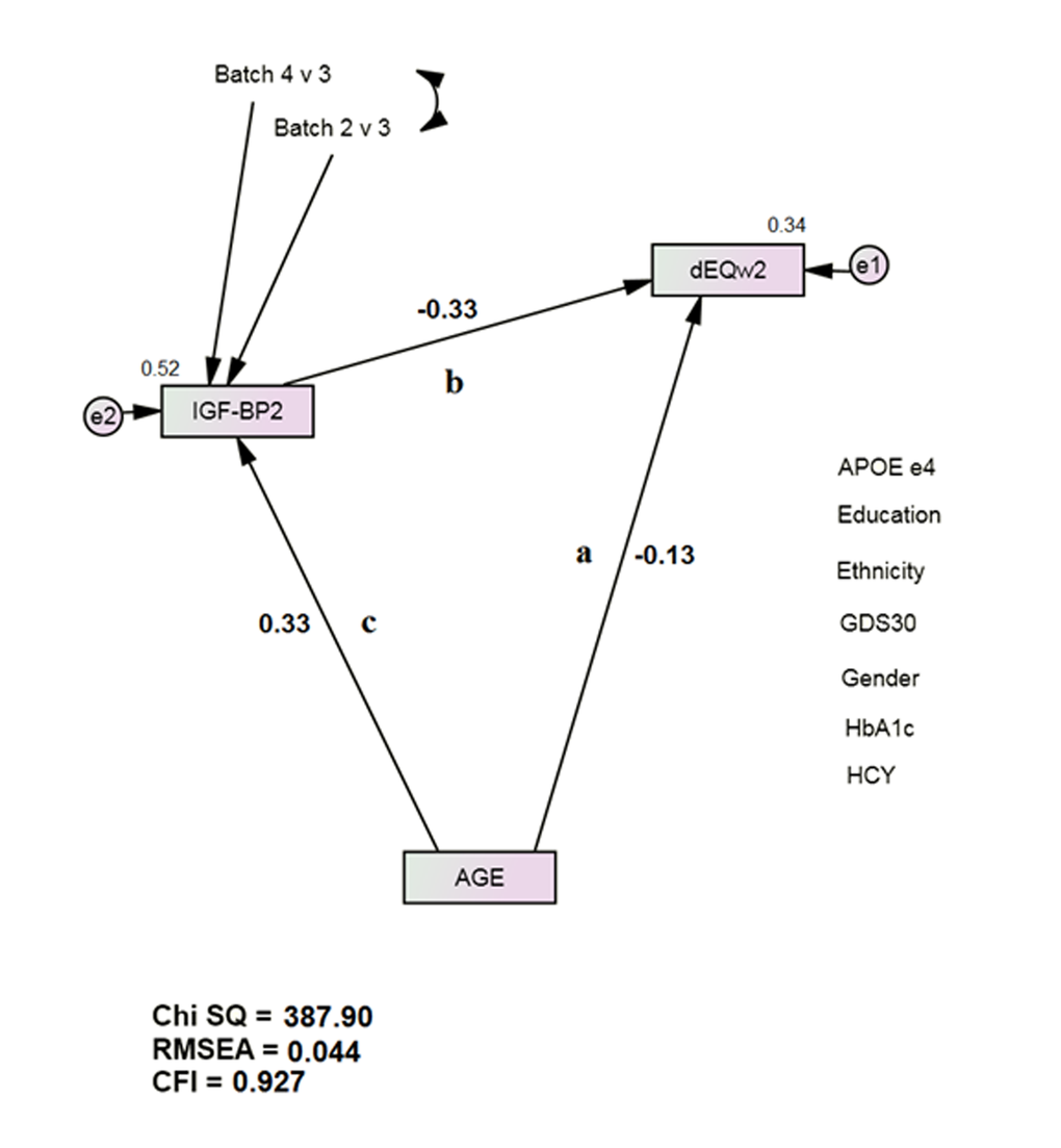 On the other hand, we have reported serum Insulin-like Binding Protein 2 (IGF-BP2) to be a strong correlate of age’s specific cognitive effects [14]. However, age has both direct (δ-independent) and indirect (δ-related) effects on cognition. It has yet to be determined whether IGF-BP2 mediates age’s association with δ, or its δ-independent direct effects instead.