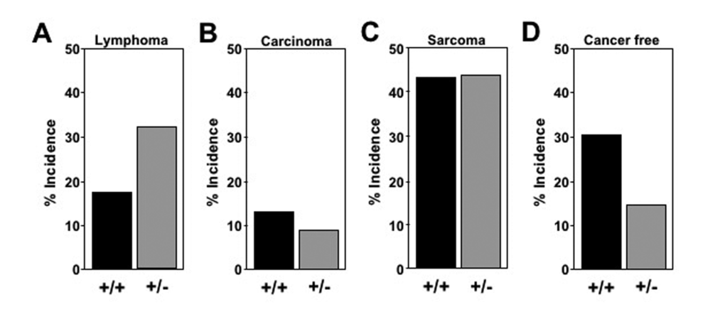 Our data that sarcomas present at a similar age suggest the overall survival difference between Mtbp+/- and Mtbp+/+ mice does not appear to be due to an overall delay in cancer development. Additionally, fewer Mtbp+/- mice were cancer-free at the time of death, a result not predicted had Mtbp only impacted longevity by decreasing and/or delaying cancer development. Notably, cancer-free Mtbp+/- mice lived significantly longer than their cancer-free wild-type littermates, suggesting that in the absence of cancer, reduced Mtbp expression conferred a survival benefit. These data suggest that the delayed presentation of lymphoma may reflect increased vitality of the Mtbp+/- mice, as lymphoma development occurred at younger ages in the wild-type cohort.