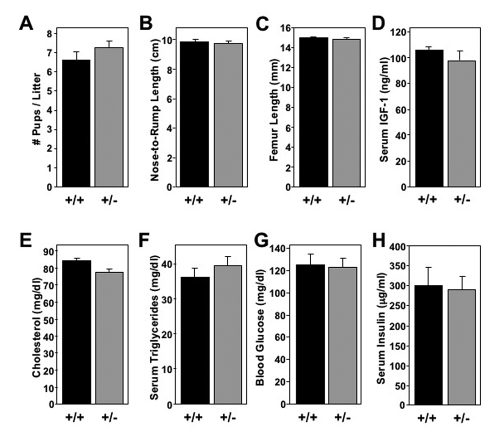 Analysis of serum was performed by the Mouse Metabolic Phenotyping Center in the Hormone Assay and Analytical Services and the Lipids and Lipoproteins Subcores at Vanderbilt University. Insulin levels were measured with a radioimmunoassay (SRI-13K, EMD Millipore, Billerica, MA, USA). IGF-1 levels were measured using a magnetic Luminex screening assay (LXSAMSM-01, R&D Systems, Minneapolis, MN, USA). Triglyceride and cholesterol levels were measured using Raichem reagents (R80035 and R84098, Cliniqa, San Marco, CA, USA).