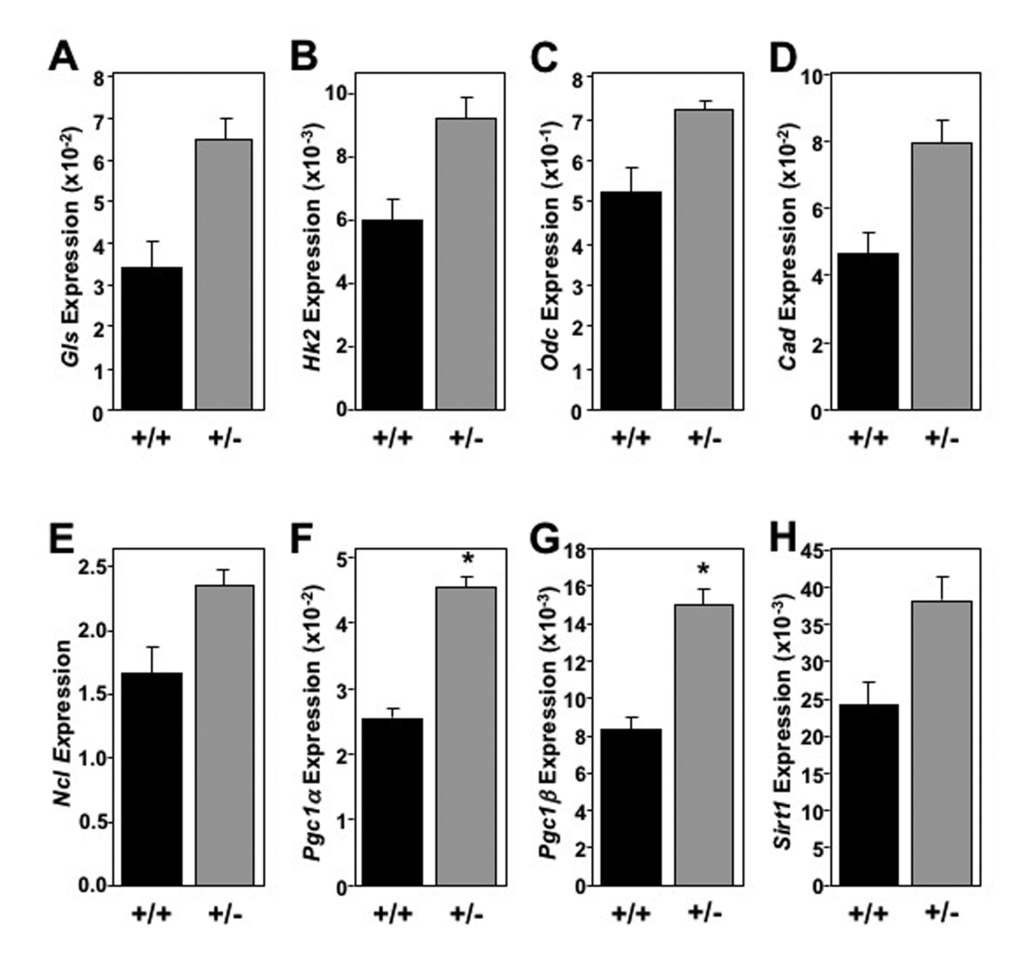 Although systemic changes in cholesterol, triglyceride, and glucose metabolism were not observed, we examined markers of cellular metabolism in tissues of long-lived mice to determine if decreased Mtbp expression modulates metabolism at a molecular level. Using flash frozen tissue at the time of sacrifice, mRNA was isolated from the liver, skeletal muscle (gastrocnemius) and brown fat pad of long-lived mice. In the liver, Mtbp+/- mice exhibited a global trend toward, and at times significantly, increased expression of metabolic markers (Figure 5), similar to previous reports for Myc+/- mice [8]. Mtbp heterozygosity resulted in a trend toward increased expression of basic metabolic genes such as Gls, Hk2, Ncl, Cad, and Odc that control cellular energy flux, protein translation, and macromolecule synthesis (Figure 5A-E). Most notably, the livers of Mtbp+/- mice showed a nearly 2-fold and statistically significant increase in the expression of Pcg1α (p=0.0106; Figure 5F) and Pcg1β (p = 0.0499; Figure 5G) compared to wild-type controls. This increase suggests elevated mitochondrial biogenesis and function in long-lived Mtbp heterozygous mice. These increased levels of metabolic markers in Mtbp+/- livers also coincided with a nearly 60% increase in the expression of Sirt1 (p=0.1529; Figure 5H), a well-known anti-aging gene linked to caloric restriction [32].
