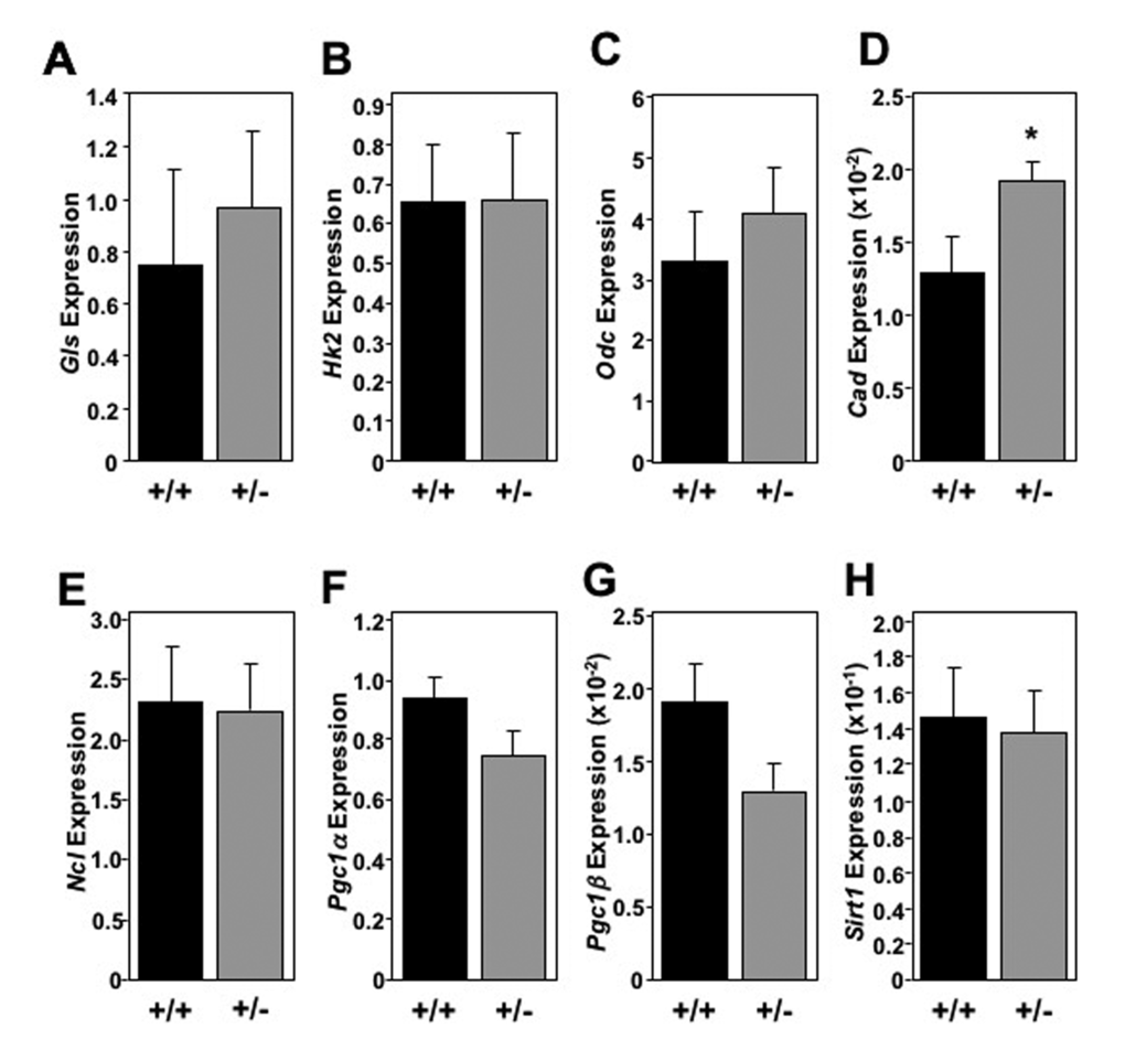 The global increase in metabolic markers observed in the livers of Mtbp heterozygous mice was largely not recapitulated in skeletal muscle (Figure 6) and brown fat (Figure 7). In skeletal muscle for example, there was only a statistically significant increase in the level of Cad in Mtbp+/- mice (p=0.0202), but analogous levels of Gls, Hk2, Odc, and Ncl compared to Mtbp+/+ mice (Figure 6A-E). There was a trend toward significantly decreased expression of Pcg1α (p=0.0736; Figure 6F) and Pcg1β (p=0.0710; Figure 6G), but similar levels of Sirt1 (Figure 6H) in Mtbp heterozygous skeletal muscle. In brown fat, levels of Gls, Hk2, Odc, Cad, and Ncl were similar between wild-type and heterozygous Mtbp mice (Figure 7A-E). However, the brown fat of Mtbp+/- mice exhibited a trend toward increased expression of Pcg1α (p=0.0531; Figure 7F), but equivalent levels of Pcg1β (p=0.8492; Figure 7G). The levels of Sirt1 were analogous between the two genotypes (Figure 7H). Therefore, the data show Mtbp heterozygosity alters markers of cellular metabolism in disparate tissues, although the effects are more pronounced in the liver.