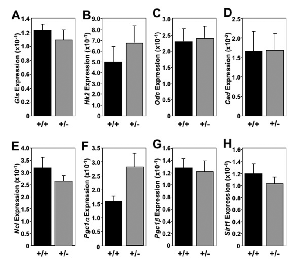 In addition to increased longevity and modulated cancer development, long-lived Mtbp heterozygous mice exhibited a global trend toward elevated cellular metabolism in the liver. While this may coincide with an overall increase in metabolism reported for Myc+/- mice [8], specific ties to aging have also been described. For example, caloric restriction, well known to improve longevity, has been previously shown to increase hepatic Gls expression [34]. Odc expression is elevated in younger livers and been implicated in the capacity for hepatic repair and regeneration [35]. We also observed increased expression of Pgc1α and Pgc1β, which regulate mitochondrial biogenesis and function. Their reduced expression with aging has been associated with many age-related pathologies [36]. Collectively, increased expression of these metabolic markers suggests retained vitality in the livers of old Mtbp+/- mice, which coincides with the elevated expression of the well-known anti-aging gene Sirt1 [5].