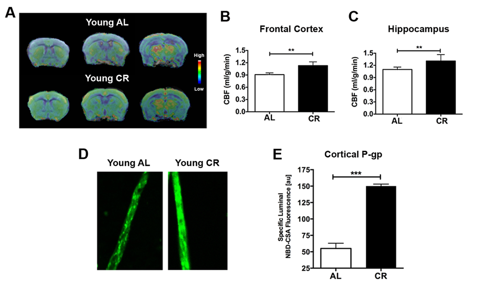 Caloric restriction (CR), without malnutrition, is the most studied intervention that has been shown to extend the longevity of a broad range of species [13–15]. In the central nervous system, CR has also been shown to induce anti-inflammatory mechanism, reduce oxidative stress and promote synaptic plasticity [16]. In aging, CR protects mitochondrial function, neuronal activity, brain volume size and white matter integrity [14,17,18]. Enhanced memory in elderly humans and aging animals has also been reported with CR [19-22]. In animal models of AD, CR reduces amyloid beta (Aβ) deposition and preserves memory [23,24]. However, the impact of CR on CBF and BBB, and the interplay between in vivo neurovascular functions, cognitive aging, and mental health, remain unknown.