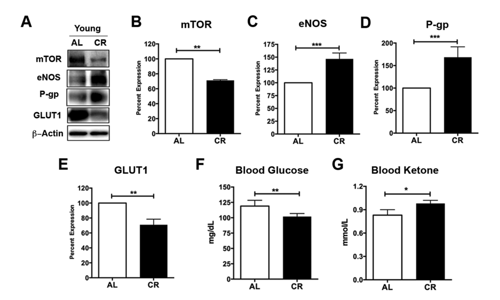 Reduced mTOR also implies metabolic status changes, we thus measured levels of the glucose transporter 1 (GLUT1) using Western blot (Fig. 2A). We observed a significant decrease of GLUT1 in young CR mice compared to the young AL mice (decrease to 70.9 ± 7.5% over 100% controls; p < 0.01; Fig. 2E). This is consistent with blood glucose results, showing that CR mice had significantly reduced blood glucose levels relative to the AL mice (p < 0.01; Fig. 2F). In contrast, CR mice had significantly higher levels of blood ketone bodies compared to the AL mice (p < 0.05, Fig. 2G). This is consistent with our previous findings that caloric restriction shifts metabolism from glucose to ketone bodies utilization [17,25].