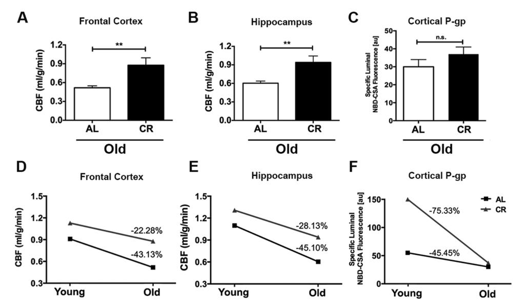 We further determined the CBF and BBB function changes in response to CR in old adult mice (18-20 months of age; 12 AL and 12 CR mice). Similar to the findings in the young mice, we found that old CR mice had significantly higher CBF compared to the old AL mice, both in the frontal cortex (p < 0.01; Fig. 3A) and hippocampus (p < 0.01, Fig. 3B). However, we did not observe a difference in P-gp activity between the two groups (p > 0.05, Fig. 3C).