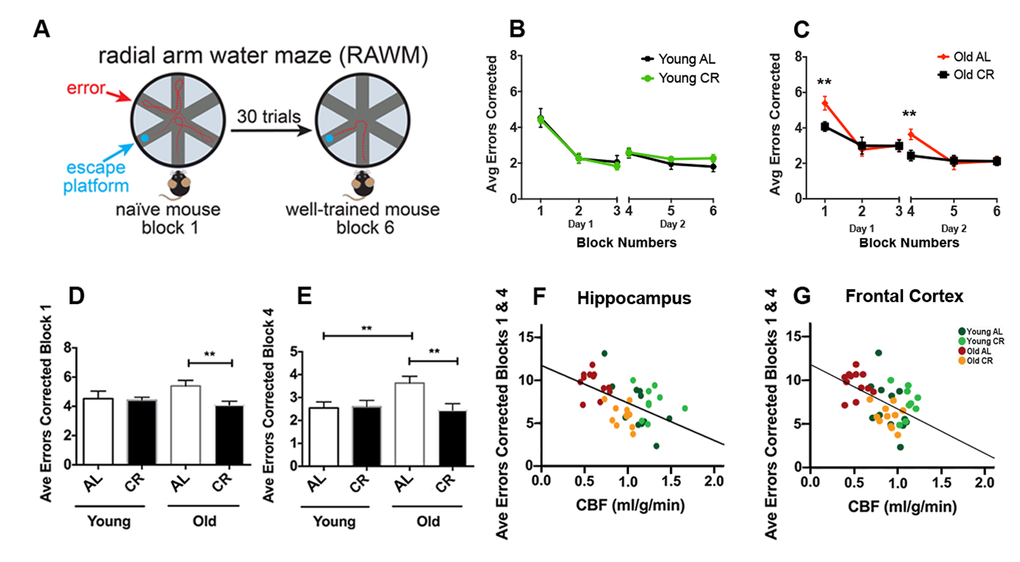 We used radial arm water maze (RAWM) to evaluate learning and spatial memory of the mice [32,33]. Fig. 4A illustrates the RAWM assessment. The task for the mice was to identify the arm which contains a hidden platform. Wrong entries of the arms were recorded as errors. The protocol consisted of a two-day testing paradigm. Day 1 was the “learning” phase where mice went through three blocks (Blocks 1-3; 5 trials in each block) to test learning and short-term spatial memory. Day 2 was the “recall” phase where mice went through three additional blocks (Blocks 4-6) to test long-term memory after a 24-hour retention period to locate the platform. It is expected that after the two-day training, the mouse with intact memory could find the platform with minimal errors. In young mice, we saw no significant difference between AL and CR groups (Fig. 4B). In old mice, however, AL group made significantly more errors in the initial learning phase (Block 1; p < 0.01) and the initial recall phase (Block 4; p < 0.01), compared to the CR group (Fig. 4C). In addition, we found that old CR had similar performances in both Block 1 (Fig. 4D; p > 0.05) and Block 4 (Fig. 4E; p > 0.05) compared to the young mice (both AL and CR), suggesting that old CR mice had preserved learning and long-term memory abilities.
