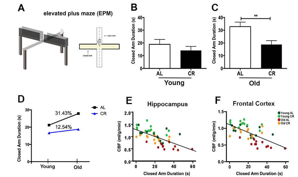We used elevated plus maze (EPM) to evaluate anxiety of the mice (Fig. 5A) [34]. The EPM consists of two open and two closed arms. Closed arms are perceived as safe zones, and thus mice with higher anxiety had tendency to stay in the closed arms. We determined the anxiety-related behavior by measuring the time spent in the closed arms over the 5 min. test session. For the young mice, we did not find significant differences between the CR and AL groups (p > 0.05; Fig. 5B), though CR mice had a trend of less time in the closed arms. In contrast, old AL mice spent significantly longer time in the closed arms compared to the old CR mice (p < 0.01; Fig. 5C), indicating higher anxiety of the old AL mice. Consequently, when comparing the age-related performances, the AL group showed higher increases in anxiety (31.43% group averaged) compared to the CR mice (12.54% group averaged) (Fig. 5D). We also found it had significant and inverse correlations between closed arm duration and CBF in hippocampus (r2 = 0.40, p < 0.0001; Fig. 5E) and in frontal cortex (r2 = 0.39, p < 0.0001; Fig. 5F).