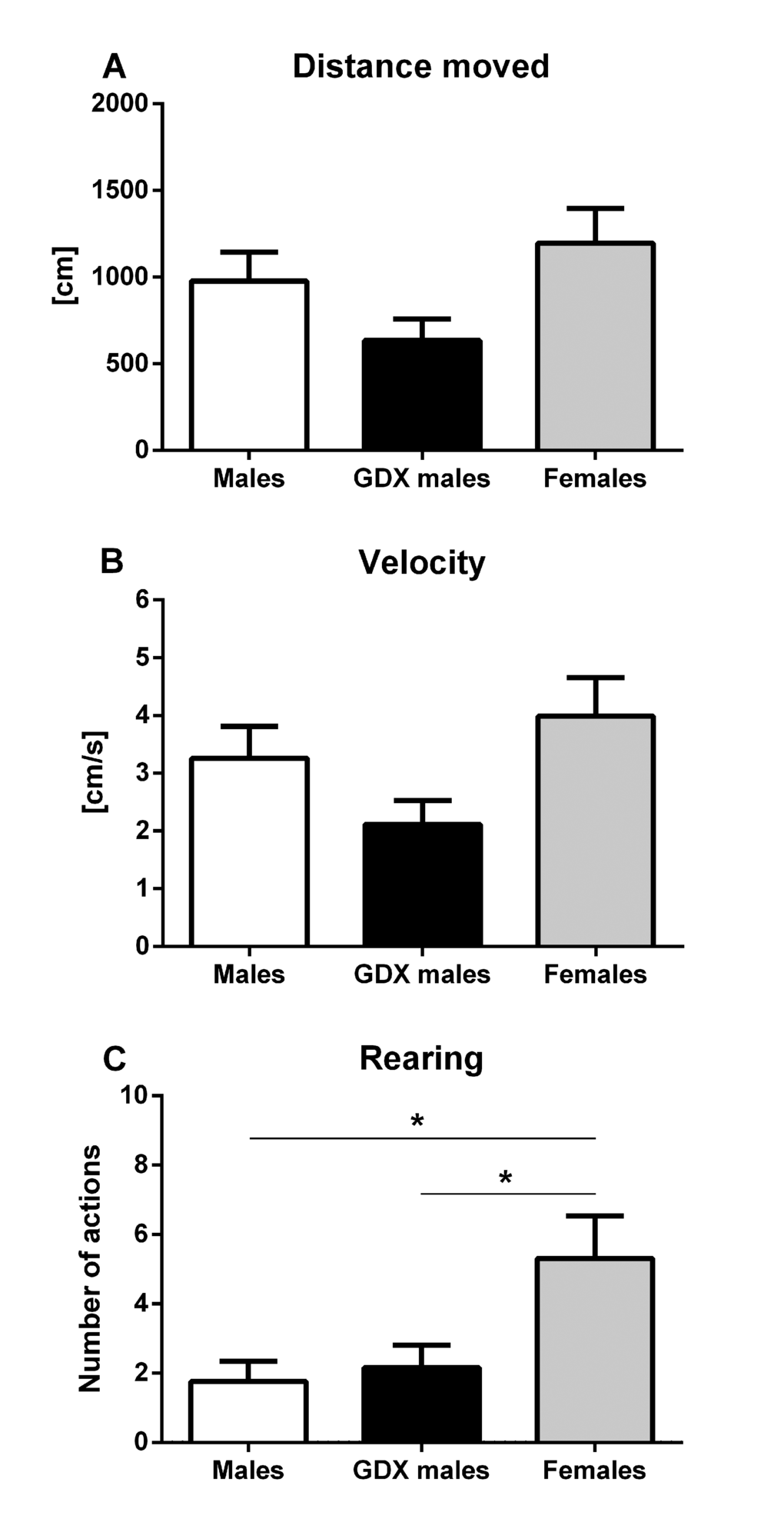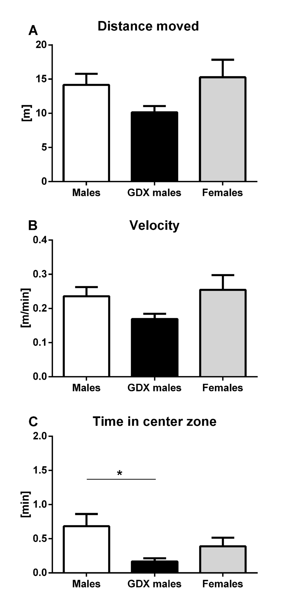 No differences were observed in horizontal locomotor activity measured by distance moved and average velocity of the movement during the total of 1 h testing period (F=2.354, p=0.109) between groups (Fig. 7A, B). GDX males spent significantly less time in the center zone compared to intact males (F=3.774, p<0.05, Fig. 7C).