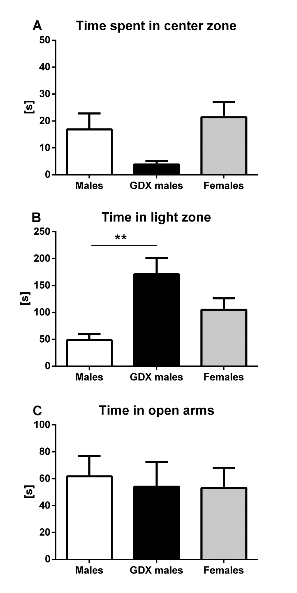 Anxiety-like behavior was assessed in three types of behavioral tests. In open field, no significant differences were detected in time spent in the center zone, although GDX males tended to spend less time in center zone compared to females (F=2.940, p=0.067, Fig. 2A). In light/dark box, GDX males spent longer time in the light compartment than control males (F=7.656, p<0.01, Fig. 2B). The elevated plus maze test did not show any significant differences in time spent in open arms between groups (F=0.085, p=0.919, Fig. 2C).