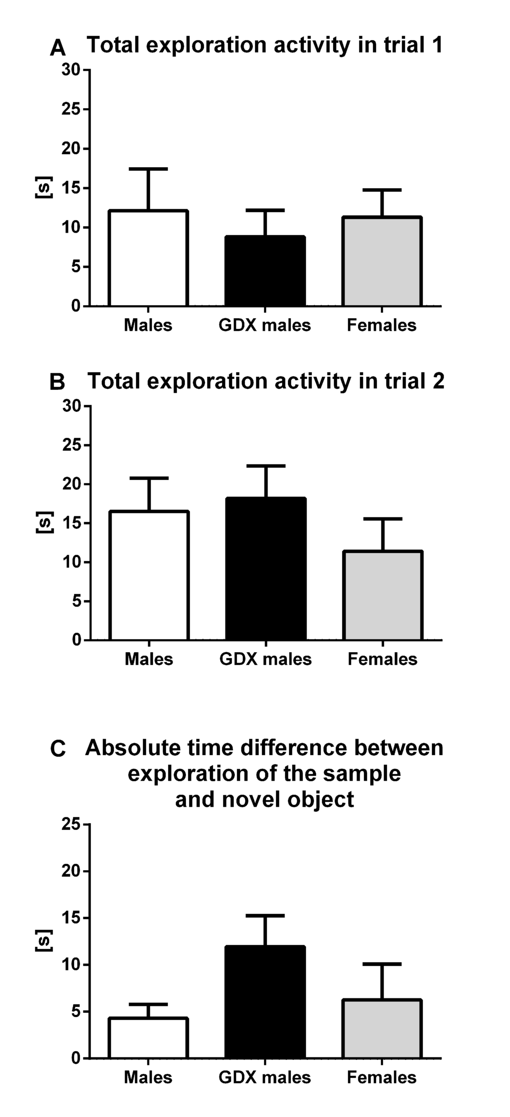 The only consistent significant sex difference was observed in depression-like behavior, where males spent longer time immobile than females. This is in line with the findings of a previous study analyzing the behavior of aged mice [20]. However, in that study single administration of testosterone or other androgens had an antidepressive effect. In our study, acute testosterone treatment had no effect on depression-like behavior of aged rats. The main difference between the studies besides the species used (mice vs. rats) is the gonadal status of the treated male animals – intact vs GDX. It is, however, unclear whether this fact can explain the differences in the outcomes. Especially, as some studies on young rats showed no effect of acute testosterone administration on anxiety- and depression-like behavior as well [33].