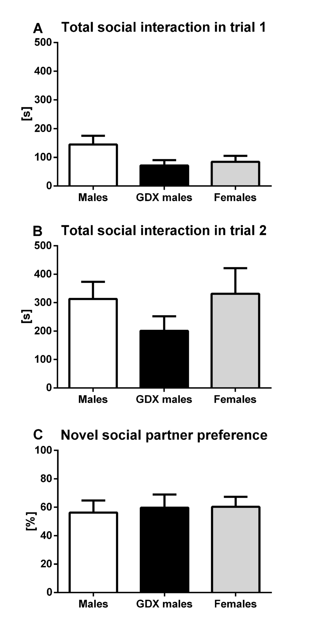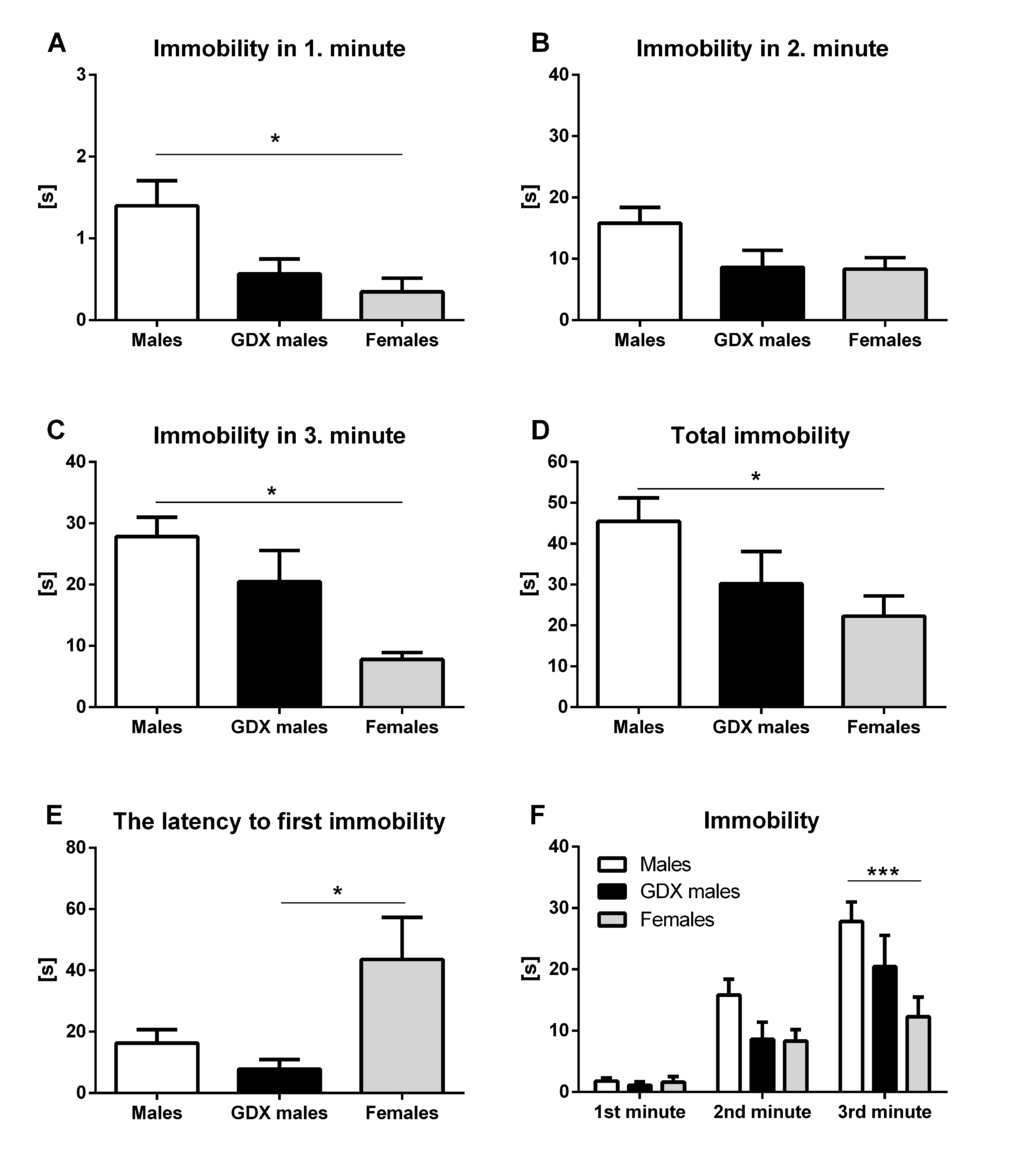 Male and female brains differ in their structure and function [1–3]. In humans and rodents, it has been shown that these differences begin early in development and are mainly caused by the action of sex steroids such as testosterone [4–6]. Brain masculinization in male animals in contrast to females was proved in many behavioral characteristics including affective performance and cognitive function. Previously, gender differences were observed in locomotor activity, [7] anxiety- [8] and depression-like behavior [9], sociability [10] and cognitive function [11]. Sex-specific behavior and its variability are associated with the interindividual as well as intraindividual variability of the endocrine network, especially of the sex hormones.