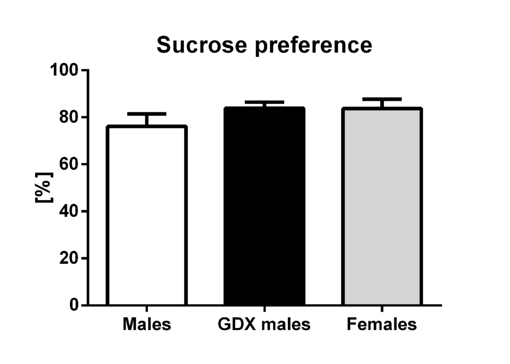 The sucrose preference test consisted of a two-bottle choice paradigm. Rats were placed in metabolic cages for 24 hours. During this period, rats were given access to two bottles, one with 2% sucrose solution and a second with tap water. To eliminate side preference artifact, the position of the bottles was switched after 12 hours. The rats had no access to food with food deprivation during the entire length of the test. No previous food or water deprivation was applied prior the test. Sucrose preference was tested without prior exposure to sucrose. The consumption of water and sucrose solution was measured by weighing the bottles and subtracting the volume of the spilled out liquid in a special container of metabolic cages at the end of the test. The preference for sucrose was calculated as the percentage of the consumed sucrose solution from the total volume of liquid drunk. The decreased preference for sucrose was considered as a mark of anhedonia-like behavior [49,50].