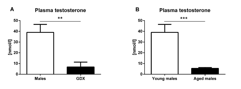 In young adults, significantly lower testosterone concentration was detected four weeks following gonadectomy (F=2.775, p<0.01, Fig. 8A). Significantly lower plasma testosterone concentration was also detected in aged male rats compared to young males (F=63.30, p<0.001, Fig. 8B).