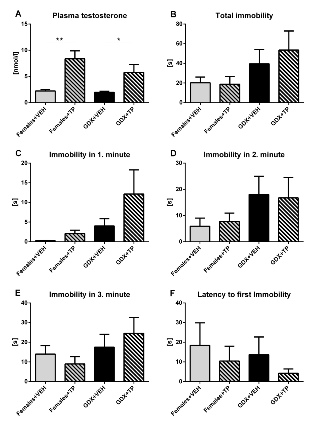 To examine the acute effect of testosterone on depressive-like behavior, GDX males and females received subcutaneous injection of testosterone propionate (TP) or vehicle (olive oil) 20 min before testing in forced swim test. Acute testosterone treatment caused an increase in plasma testosterone concentration in both GDX males and females compared to their vehicle treated controls (p<0.01, Fig. 9A). There were no significant differences in any of observed parameters of the forced swim task including total immobility duration (p=0.409, Fig. 9B), time spent immobile in the 1st min (p=0.088, Fig. 9C), in 2nd min (p=0.52, Fig. 9D), in 3rd min (p=0.394, Fig. 9E) and in the latency to first immobility (p=0.767, Fig. 9F) between groups.