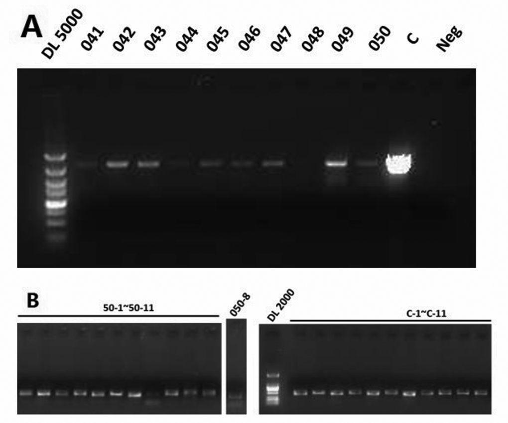In order to analyze the HBV mutation and quasispecies by ultra-deep pyrosequencing (UDPS), we designed a two-rounds PCR to amplify the HBV DNA. In the first round PCR, the whole 3.2kb genome of HBV was amplified; subsequently, we 11 overlapping fragments were amplified in the second round PCR. First round PCR was performed with 4ul of HBV DNA in a 50μL reaction mixture containing 5μL of expand high fidelity PCR buffer, 10mM dNTPs (1.0μL), 1.0μL for each primer (forward and reverse) [21], 0.5μL of expand high fidelity Taq and 37.5μL of ddH2O. Amplification condition consisted of 94 °C for 2 min followed by 30 cycles of denaturation of 30 sec at 94 °C, annealing of 1 min at 60 °C, and extension of 3 min at 72 °C, with final 5 min extension at 72 °C. The 50μL reaction mixture of second round PCR containing 1.3μL of first round PCR product, 5μL of expand high fidelity PCR buffer, 10mM dNTPs (1.0μL), 2μL of primer contained UDPS barcode, 0.5μL of expand high fidelity Taq and 40.2 μL of ddH2O. Amplification condition for second round PCR was as follows: 94 °C for 2 min followed by 22 cycles of denaturation of 30 sec at 94 °C, annealing of 30 sec at 55 °C, and extension of 40 sec at 72 °C, with final 5 min extension at 72 °C. Both two round PCR products have been detected and photographed by using agarose gel electrophoresis (See Figure 1). The second round PCR products were then purified with AMPure beads (Beckman Coulter Inc., Brea, CA, USA) and subjected to deep sequencing performed using the GS FLX system (Roche Applied Science, Bandford, CT, USA) under the guidance of the manufacturer’s instructions.