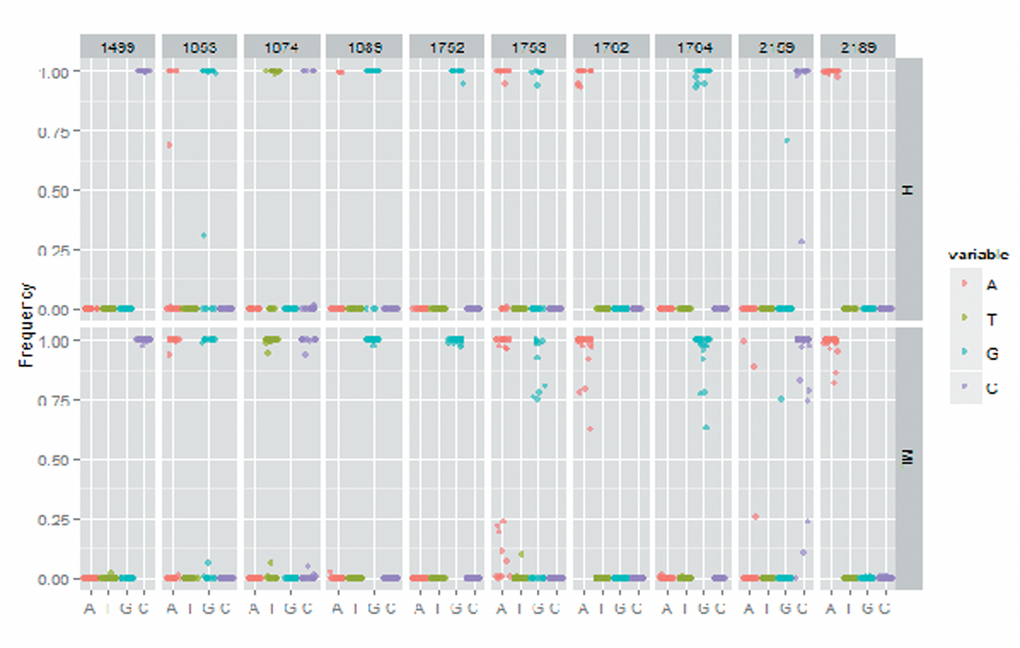 No significant difference was found in the mutation rate of T1689 and C1752 between two groups. As for A1499, the statistical analysis suggested that the mutation rate was significantly higher in high MBL2 group than medium/low MBL2 group. However, we found that the medium/low MBL2 group has higher mutation rate in T1653, T1674, T1753, A1726T and G1764A when being compared with high MBL2 group, and significance was observed (Table 3 and Figure 2).