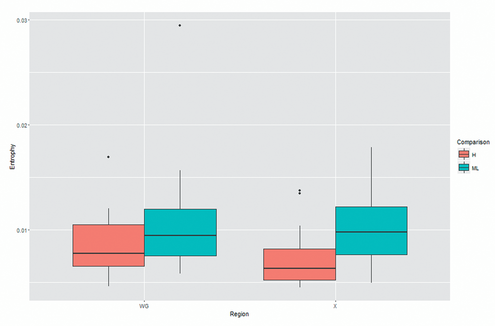 where fi is the frequency of a sequence variant and N is the length of the sequence. Both whole genome and X gene were assessed. Student’s T-test was performed to compare the difference between two groups. The frequencies of categorical variables were analyzed with Chi-squared test. A P-value smaller than 0.05 was considered as significant. Unless specified, all statistical analyses were performed by using IBM Statistics SPSS version 19.