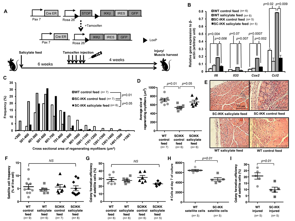 Young (2–3 month) and aged (24 month) C57BL/6 mice were obtained from pathogen-free breeding colonies at Jackson Laboratories and Charles River Labs. MISR (a kind gift from S. Shoelson [14], and Pax7Cre-ER mice (a kind gift from C. Keller [25] were bred in house; loxP-STOP-loxP-IKKβ (C57BL/6-Gt(ROSA)26Sortm1(Ikbkb)Rsky/J) mice were purchased from Jackson Labs. Fidelity of the Pax7-CreER line for satellite cell-specific gene expression has been validated previously [25]. Tamoxifen (0.1 mg /g body weight, Sigma Aldrich) or corn oil vehicle (10 μl /g body weight) was injected for 5 consecutive days. For sodium salicylate treatment, a feed containing 3 grams of sodium salicylate (Sigma Aldrich) per kg was created by Research Diets, and purchased along with control feed containing the same nutritional content but lacking salicylate. Mice were provided sodium salicylate or control feed ad libitum for 6 weeks prior to experimentation, including two weeks prior to tamoxifen treatment. For injury experiments on salicylate-treated mice, animals were continued on salicylate feed during recovery after injury (7 days or 14 days). Animals were housed at the Biomedical Research Institute at Harvard University and the animal facility at the Joslin Diabetes Center. Animal procedures conducted in this study were reviewed and approved by Institutional Animal Care and Use Committees (IACUC) at Harvard’s Faculty of Arts and Sciences and at the Joslin Diabetes Center.