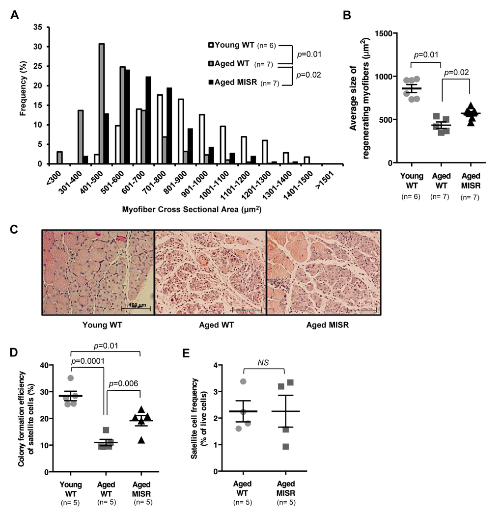 One possible strategy to test the hypothesis that activation of NF-κB in muscle fibers rather than in satellite cells is a critical driver of age-associated defects in muscle regenerative potential would be to use a muscle-specific Cre driver to activate the same IKKβca allele in muscle fibers. In fact, such animals have been generated using the muscle fiber-specific muscle creatine kinase- (MCK-) Cre allele [14]; however, analysis of skeletal muscle in these “MIKK” animals (for muscle fiber specific IKKβ production) revealed a profound muscle wasting phenotype, which would likely confound any evaluation of satellite cell number or function in these animals. Therefore, to evaluate the importance of muscle fiber-specific activation of NF-κB signaling in muscle aging, we took a converse approach, examining satellite cell and muscle regenerative function in aged “MISR” mice, which harbor a transgene that dominantly blocks NF-κB signaling in skeletal muscle fibers (but not satellite cells) via constitutive expression of the IκB super-repressor (ISR) under the MCK promoter (Fig. S6A). MISR mice exhibit nearly complete inhibition of NF-κB activity in mature myofibers in young [14] and aged (24 month) animals (Fig. S6B, C). Life-long inhibition of NF-κB in MISR mice protected these animals from age-related loss of muscle regenerative potential, as indicated by an increased caliber of regenerating fibers following cryoinjury in aged MISR mice as compared to age-matched wild-type controls (Fig. 2A-C). Improved regeneration in aged MISR mice was accompanied by an improvement in satellite cell myogenic activity (Fig. 2D), although age-related reductions in satellite cell frequency were unaffected (Fig. 2E). No differences were noted in muscle repair or in satellite cell activity or frequency in young MISR mice, compared to littermate controls (Fig. S7). Thus, modulating NF-κB regulated gene expression in mature muscle fibers produces a cell-non-autonomous impact on resident satellite cells, consistent with a local “niche” effect of aging on satellite cell function.