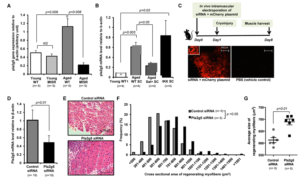 Data are presented as mean ± standard error of mean (s.e.m.). For all graphic data, n indicates the number of biological replicates. The number of animals used per group was determined based on accumulated empirical data in the laboratory and anticipated robustness of the data points [4,21,47]. The number of animals for each experiment was appropriate to detect the differences, if present, in the experimental outcomes. For salicylate feed treatment and pla2g5 knockdown experiments, animals were randomly allocated for different treatment conditions. Animals diagnosed with severe health concerns (tumors, malocclusion, etc.) by veterinary staff were excluded from analysis; this exclusion criterion was pre-determined. Data were tested for normal distribution, and the observed variation was similar between groups. Statistical comparisons for normally distributed data were performed using appropriate tests, as indicated below. Results comparing two different groups were assessed for statistical significance using Student’s t test (Microsoft Excel; GraphPad Prism, GraphPad Software Inc.) assuming two-tailed distribution (Figure 1H,I; Figure 2E; Figure 3D,G; Figure 4A,B) and results comparing more than two groups were assessed by one-way ANOVA with Turkey’s multiple comparison test (GraphPad Prism, GraphPad Software Inc.; Figure 1B,F,G; Figure 2D; and Figure 3A,B). For statistical analyses of distribution and average of regenerating myofiber sizes in injured muscles, p-values were calculated by Kruskal-Wallis test and adjusted, if necessary, by Stepdown-Bonferroni method (Figure 1C,D; Figure 2A,B; Figure 3F,G; and Figure 4D,E). Investigators were blinded to experimental group assignment for outcome assessment. Statistical significance was accepted at p < 0.05.