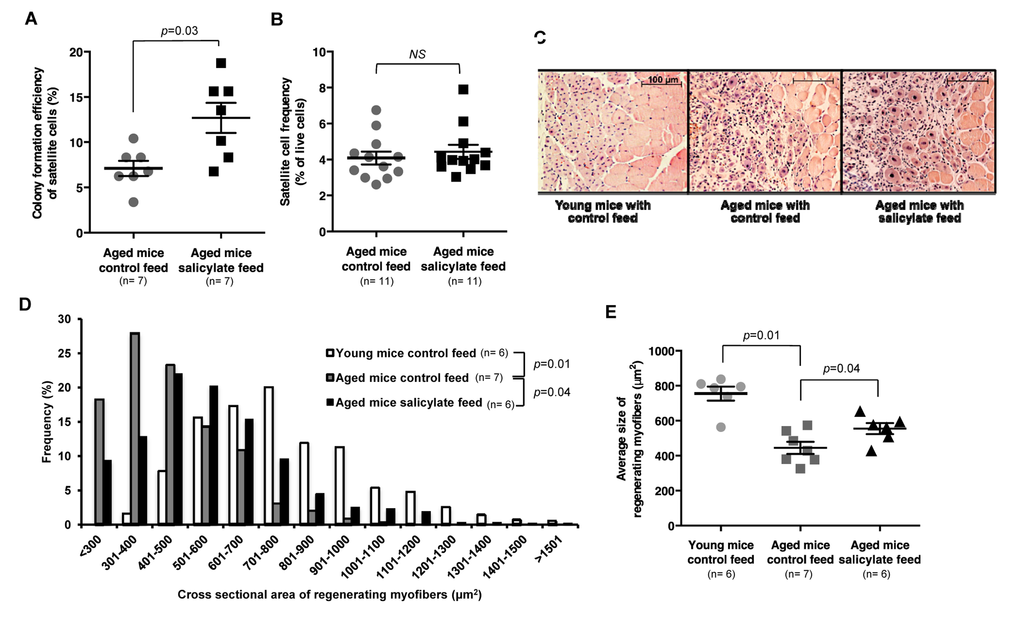 The role of anti-inflammatory therapy for the treatment of skeletal muscle dysfunction in elderly patients is a subject of ongoing investigation [41,42]. It has been shown that, following 12 weeks of exercise, NSAID therapy modestly increased muscle strength without hypertrophy in patients with osteoarthritis of the knee [43]. Trappe et al. have further suggested that NSAID treatment enhances muscle mass and strength during resistance training in older individuals, potentially by decreasing PGE2 levels in skeletal muscle [41,44,45]. Finally, our observation that high-dose sodium salicylate improves regeneration of aged muscle suggests that, similar to Losartan, the only other FDA-approved drug that has shown promise at a basic science level as a therapeutic agent [46], salsalate should similarly be considered as a potential pharmacologic therapy to boost recovery after muscle damage in elderly individuals.