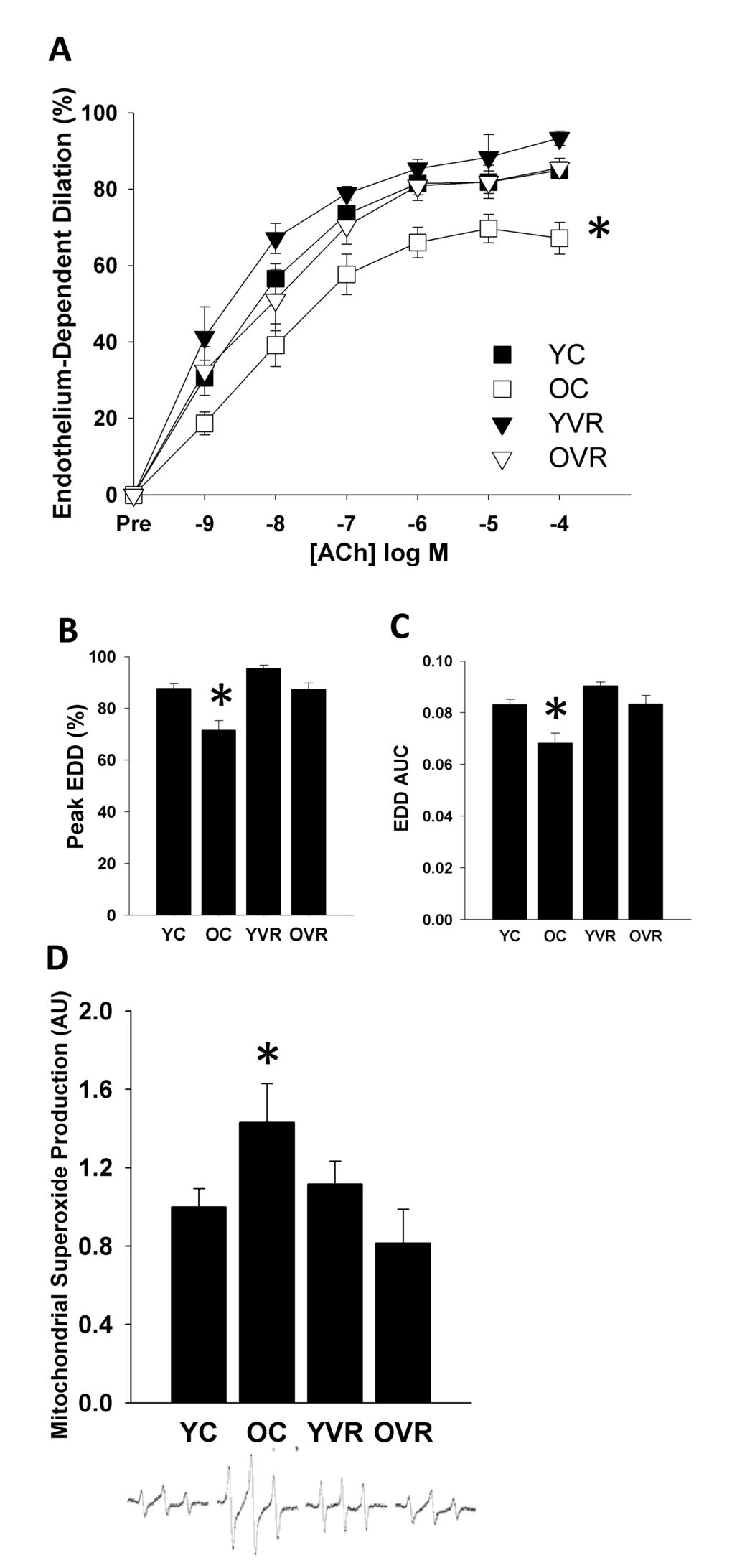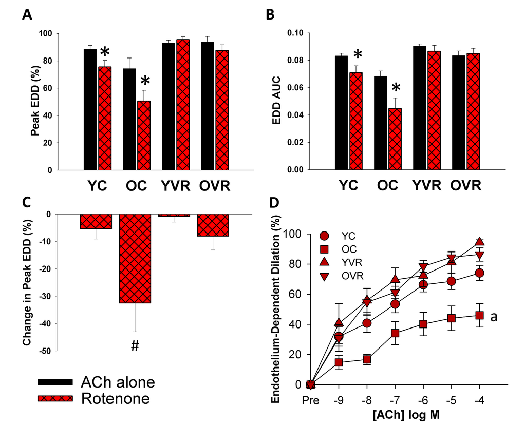 To determine the effects of an acute mitochondria-specific stress on endothelial function, following assessment of dilation in response to ACh alone as described above, a sub-set of arteries (n = 7 (YC), 8 (OC), 5 (YVR), 6 (OVR)) was incubated with 0.5 µM rotenone (Sigma Aldrich Corp.), a mitochondrial respiratory Complex I inhibitor, for 40 minutes prior to pre-constriction followed by assessment of EDD to ACh, as previously described [13]. Low doses of rotenone have been shown to increase mitochondrial superoxide production from Complex I without completely inhibiting respiratory activity [49,50]. The rotenone-induced impairment in peak EDD was determined as the relative reduction in peak dilation in the presence versus absence of rotenone ([PeakEDDACh-PeakEDDRotenone/PeakEDDACh]x100). Similarly, the rotenone-induced impairment in the EDD AUC was determined as the relative reduction in the AUC in the presence versus absence of rotenone ([AUCACh-AUCRotenone/AUCACh]x100).